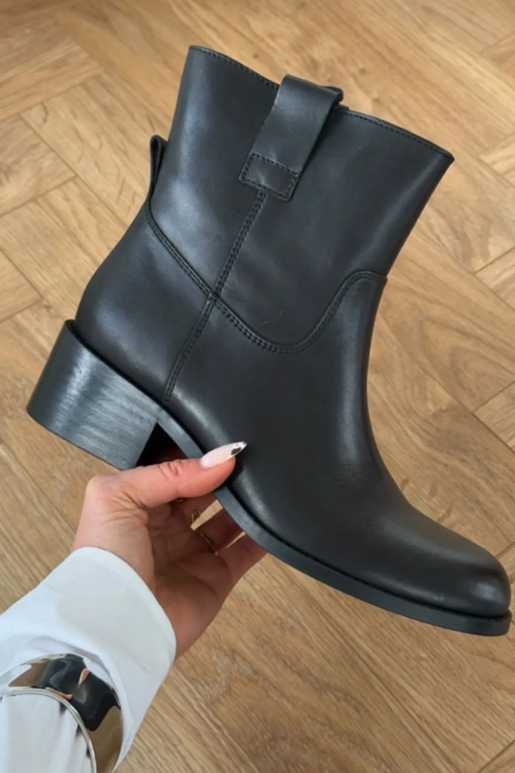 Sort ankelstøvle fra Phenumb Copenhagen med glat læderfinish og lav blokhæl. Støvlen har et enkelt design med rund tå og ingen lukning.