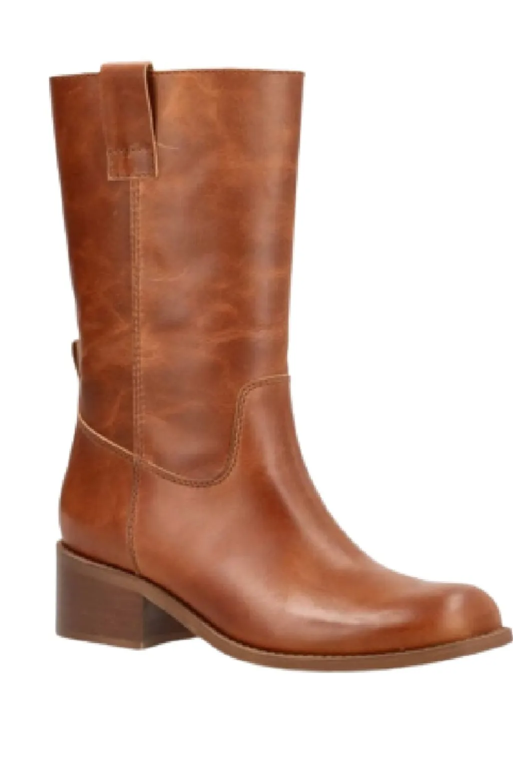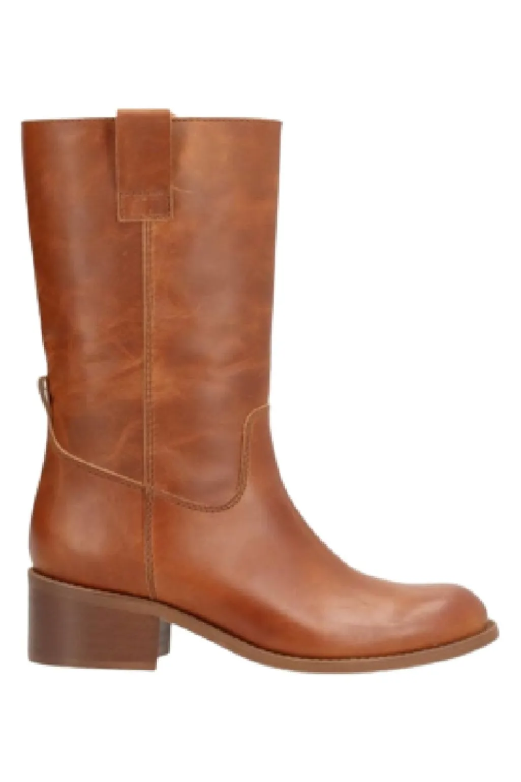 Læderstøvler i en varm cognacfarve. Støvlerne har en glat overflade og en blokhæl, der giver god støtte under gang. Den mandelformede tå giver støvlerne et afrundet look.