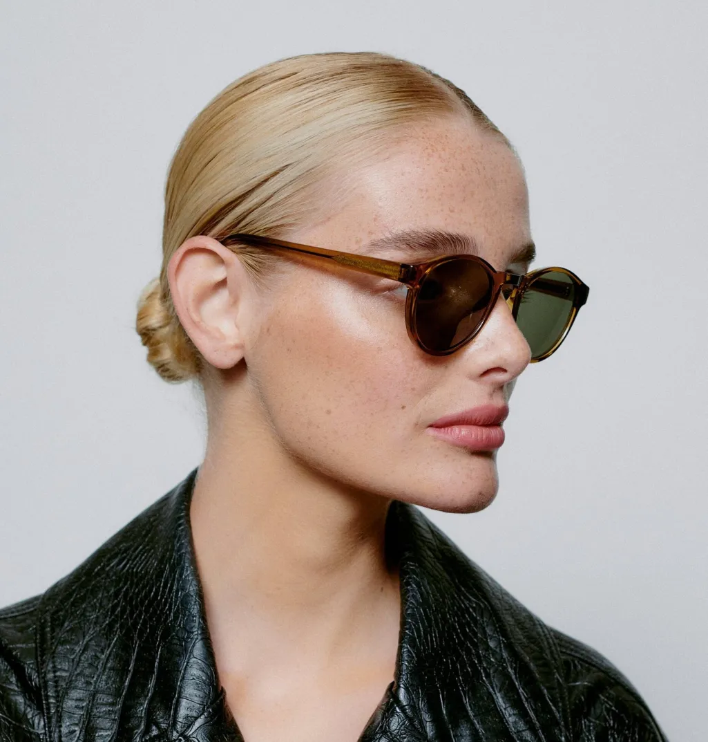 Solbriller fra A. Kjærbede med rund oval form. Stellet er fremstillet i røgfarvet, transparent polycarbonat med grønne linser og brune detaljer.