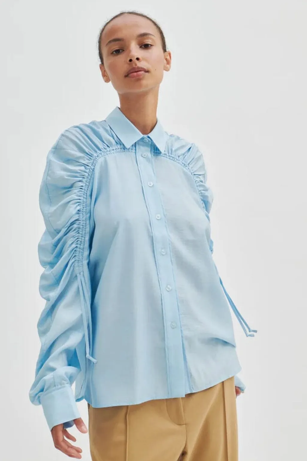 Second Female skjorte med bindebånd. Fremstillet i en glat og draperet viskoseblanding med en glansfuld finish. Med stolpelukning med detaljer på kanten samt knapper foran. Snøredetalje hen over brystet og ærmerne med dobbelt bindebånd. Lange ærmer m