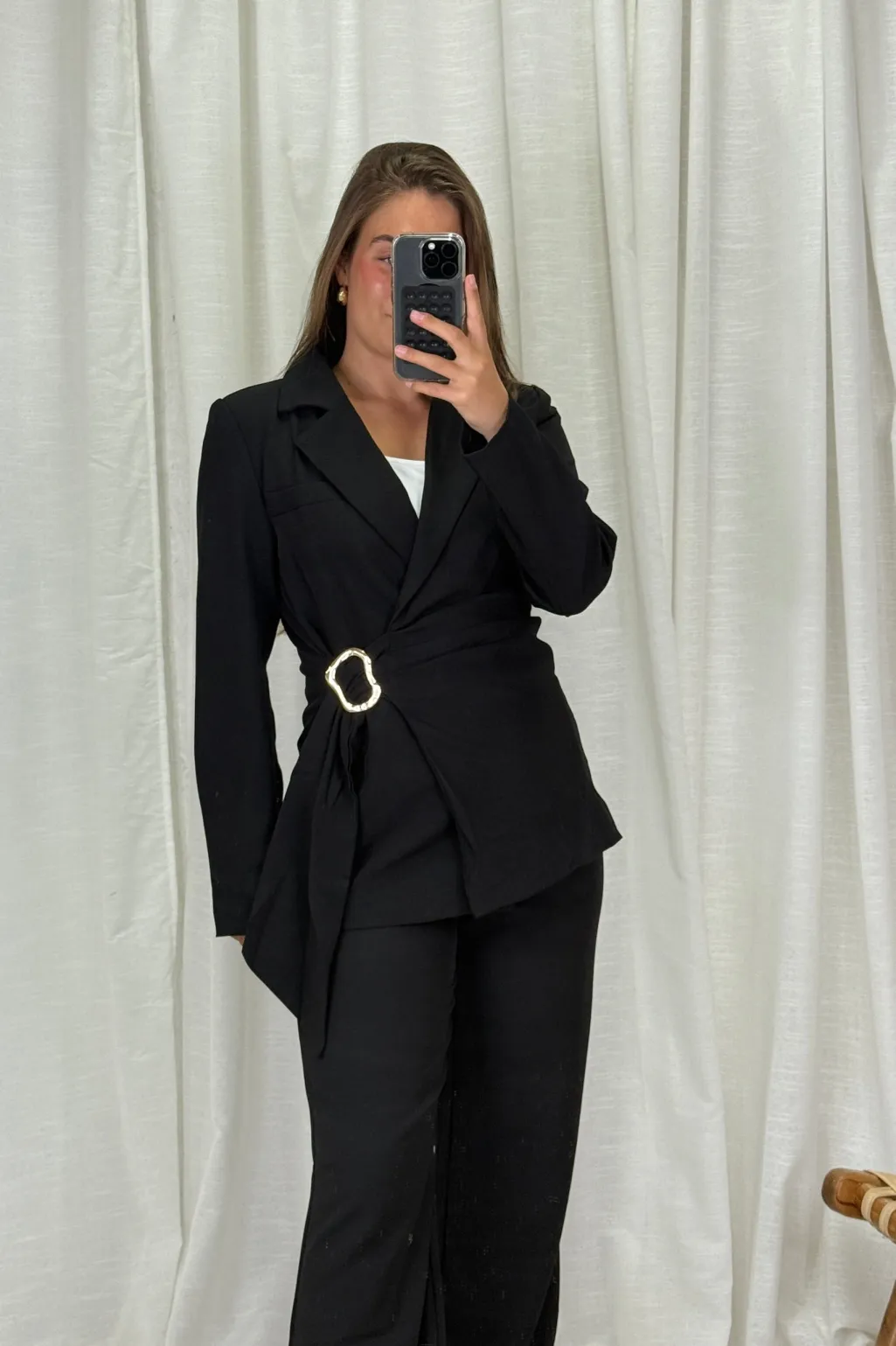 Sort blazer fra A-bee med V-hals og asymmetrisk snit. Blazeren har et guldspænde i taljen og bindingsdetaljer.