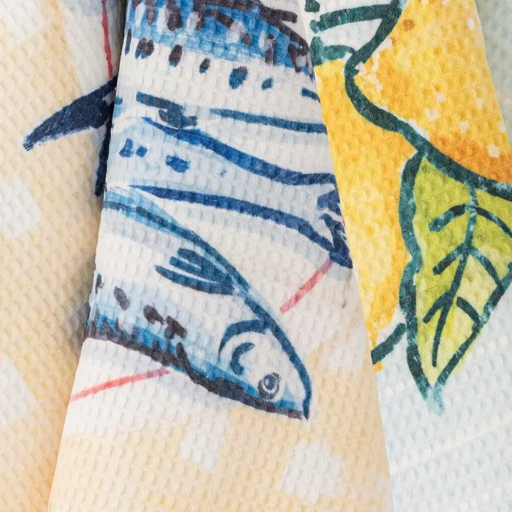 Viskestykker fra Bloomingville med middelhavsinspirerede motiver af fisk og citroner. Mikrofibermaterialet giver hurtig tørretid og god absorption.