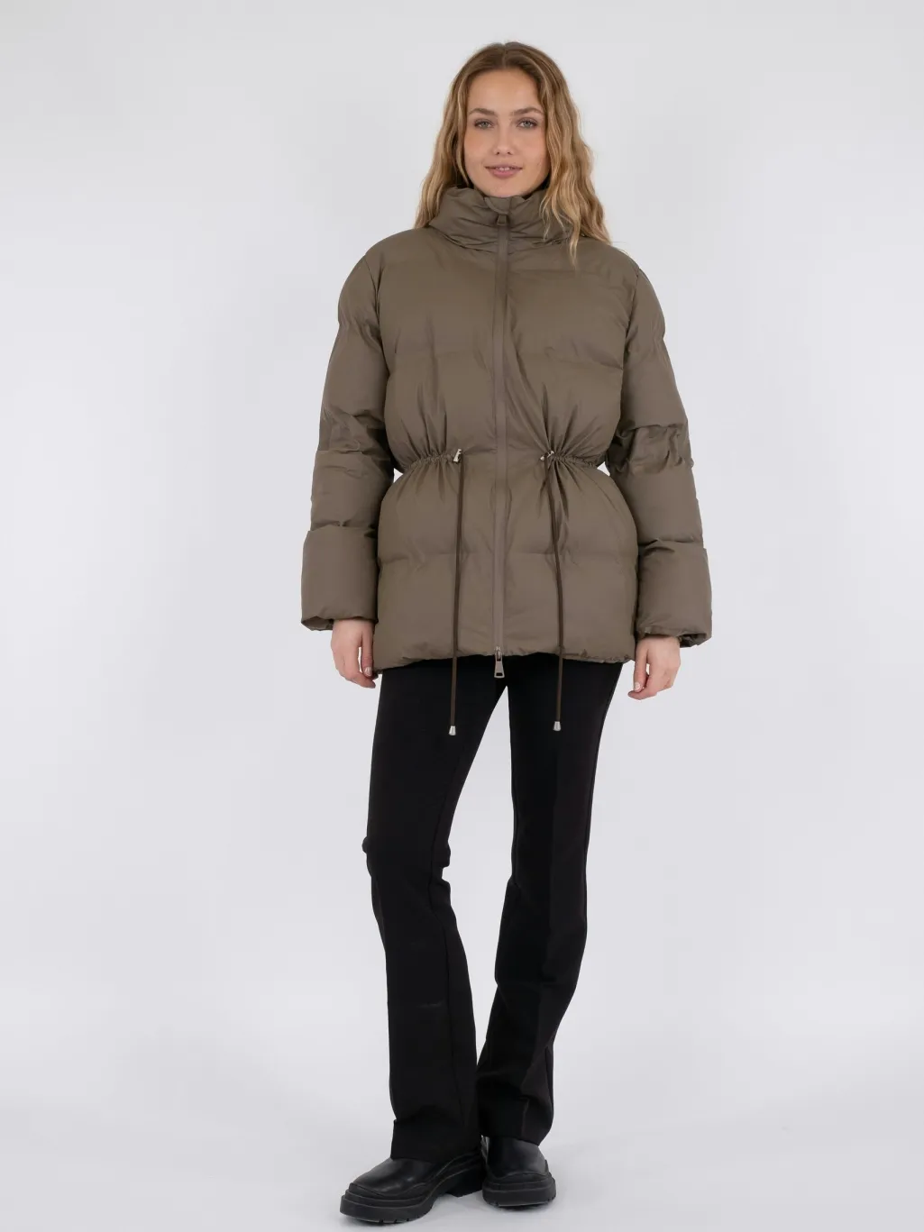Pufferjakke fra Neo Noir i mørk taupe. En vatteret jakke med høj krave og quiltet design.