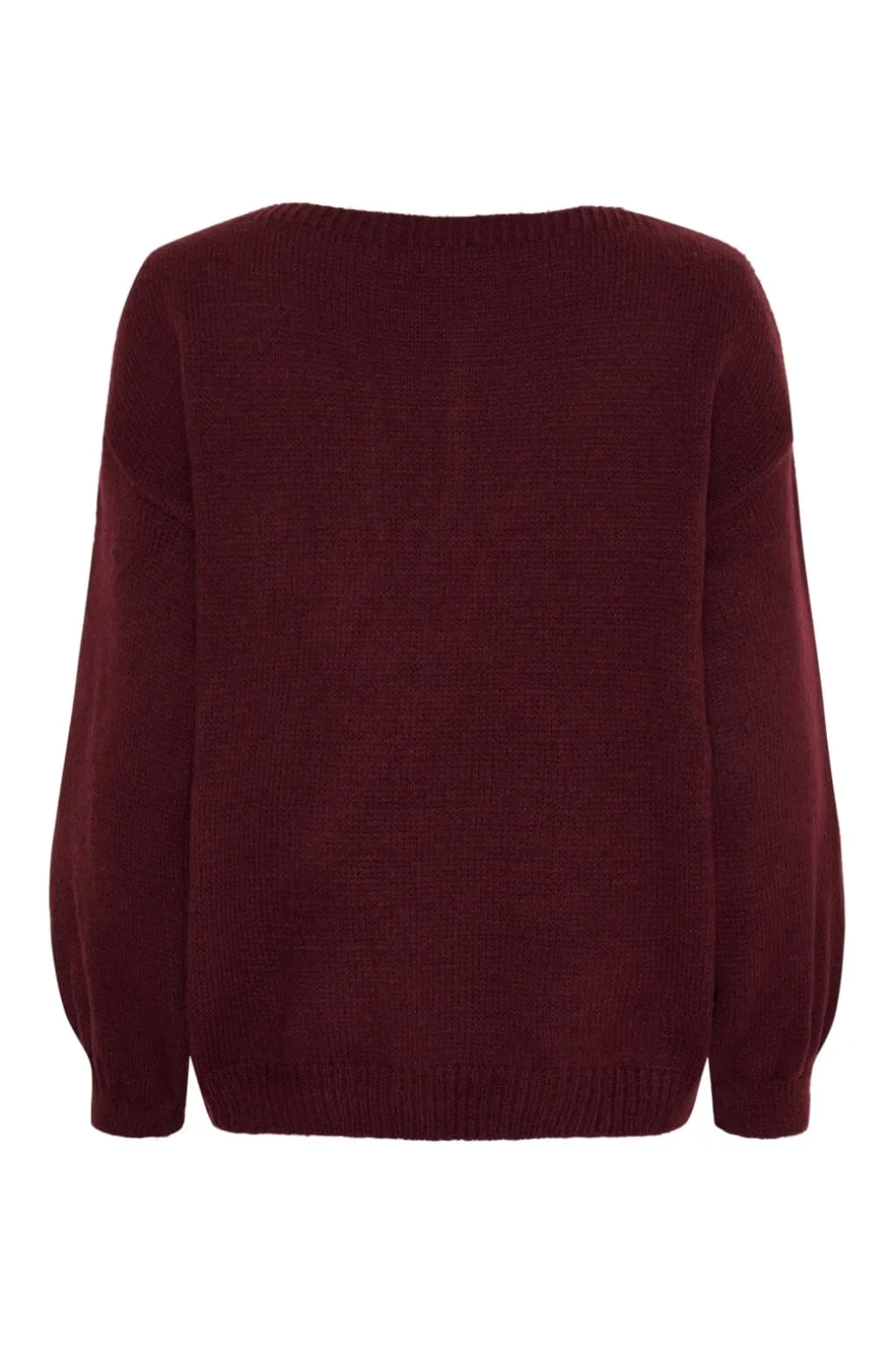 Vinrød strik fra Marta Du Chateau med hjerteformede mønstre i forskellige nuancer. Strikken har en rund hals og lange ærmer.