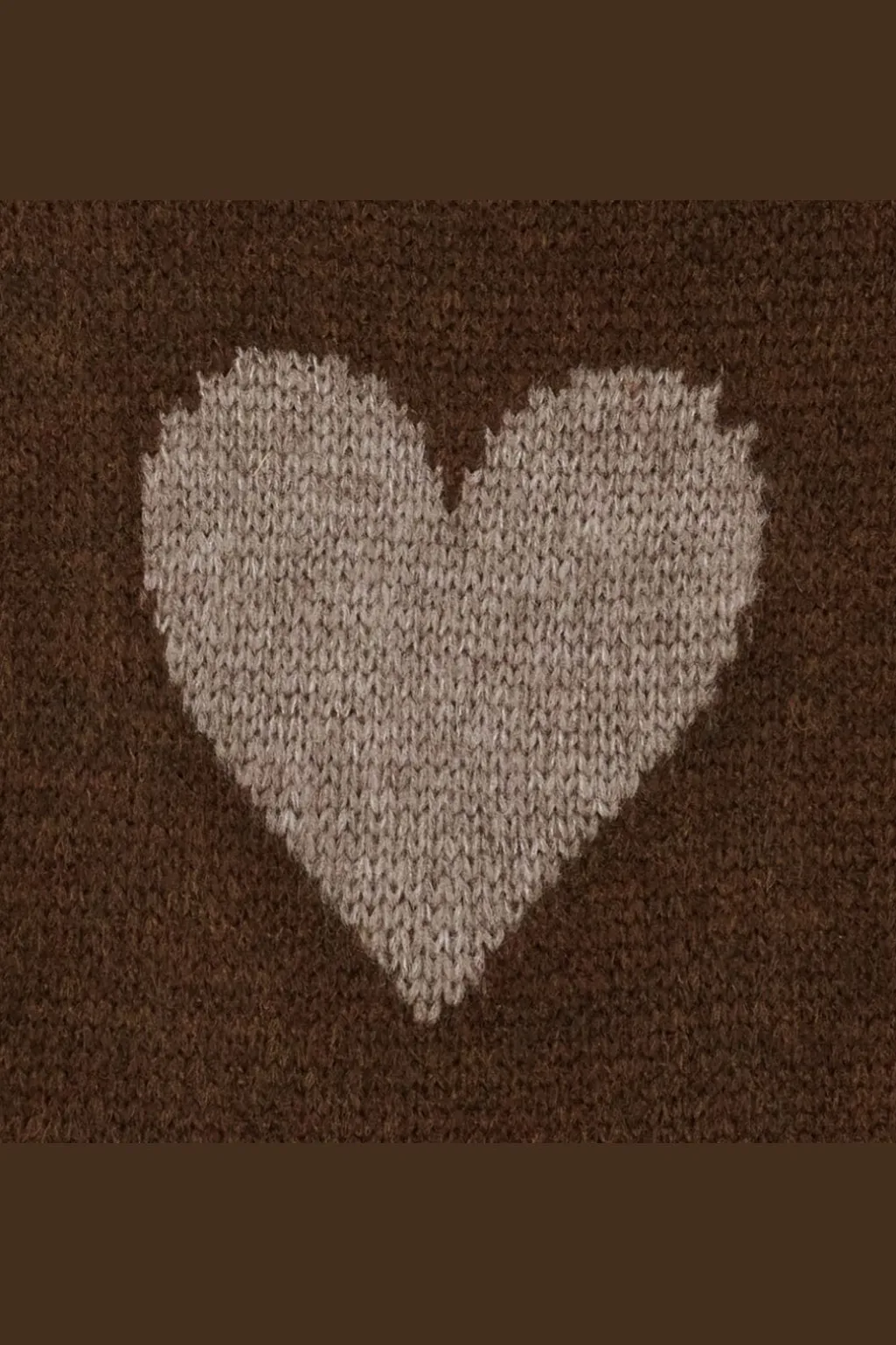Brun strik fra Marta Du Chateau med hjerteformede mønstre på forsiden i grå og bordeaux. Bagsiden er ensfarvet brun uden mønstre.