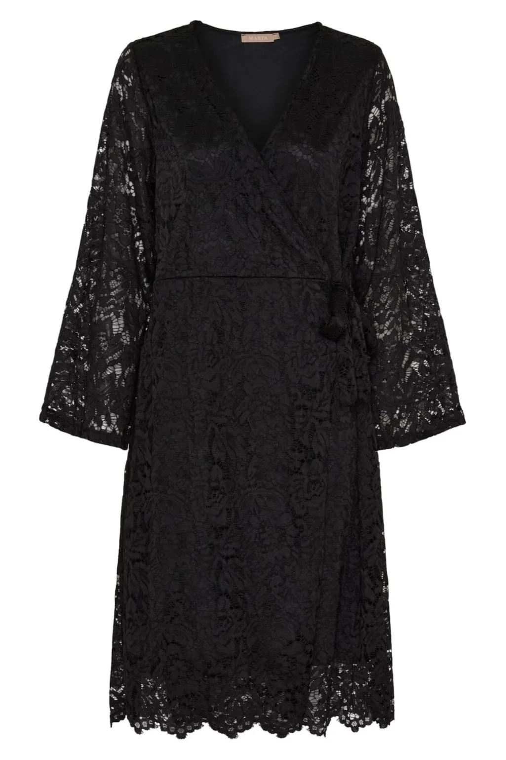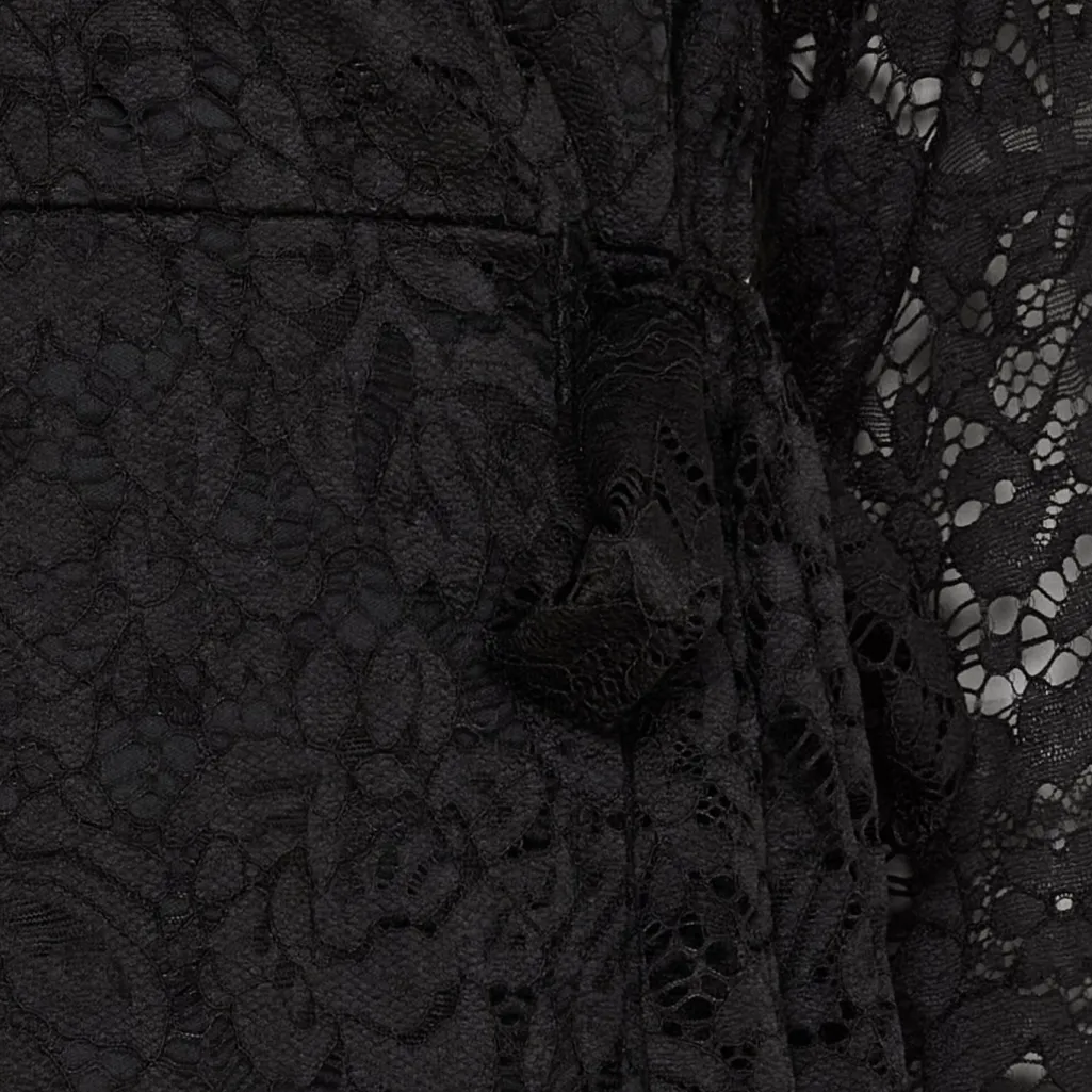 Sort knælang kjole fra Marta Du Chateau med blondedetaljer. Kjolen har en V-udskæring og bindebånd i taljen, der giver mulighed for at tilpasse pasformen.