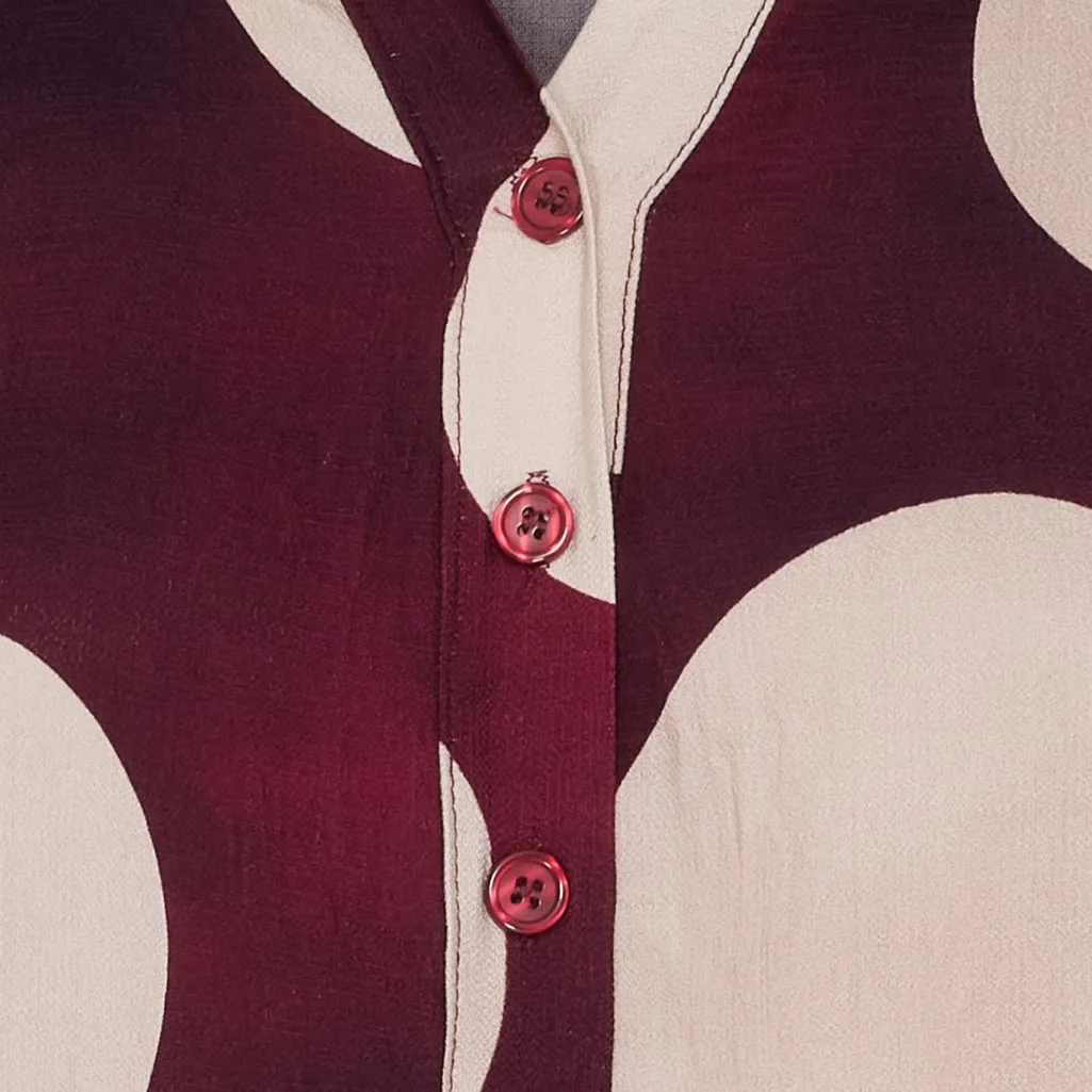 Kjole fra Marta Du Chateau i bordeaux med store hvide prikker og en ombre-effekt i bunden. Kjolen har skjortekrave, 3/4-ærmer med flæser og knapper foran.