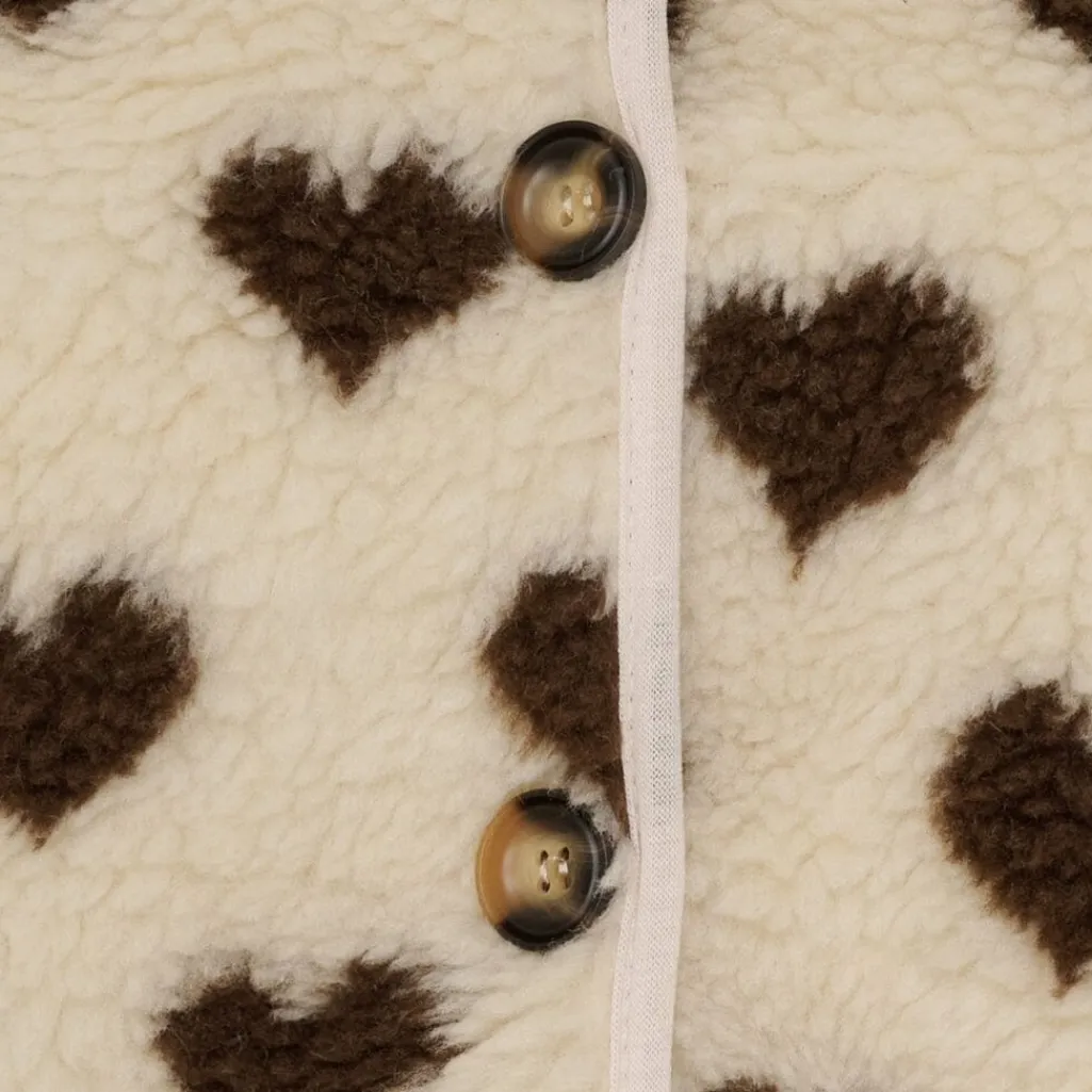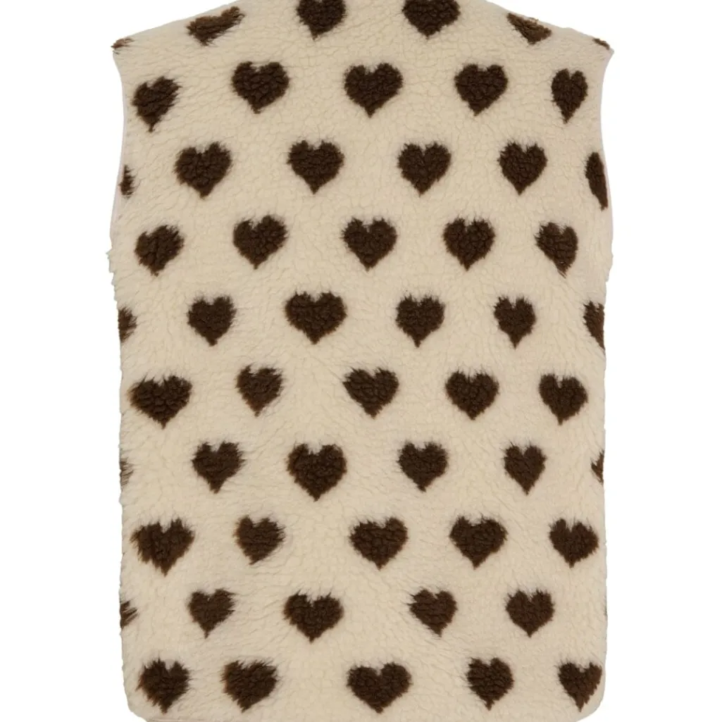 Vest fra Marta Du Chateau i creme med mørkebrune hjerteformede mønstre. Vesten har mørke kanter langs siderne og en knappelukning foran.