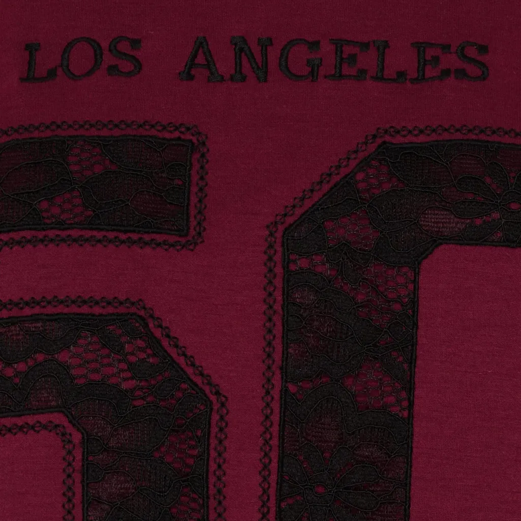 Bordeauxfarvet sweatshirt fra Marta Du Chateau med sort 50 tal og teksten LOS ANGELES Champions på forsiden. Sweatshirten har blondedetaljer og dekorative syninger.
