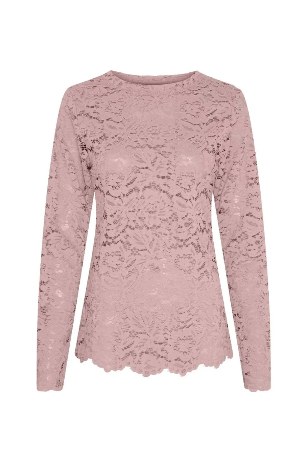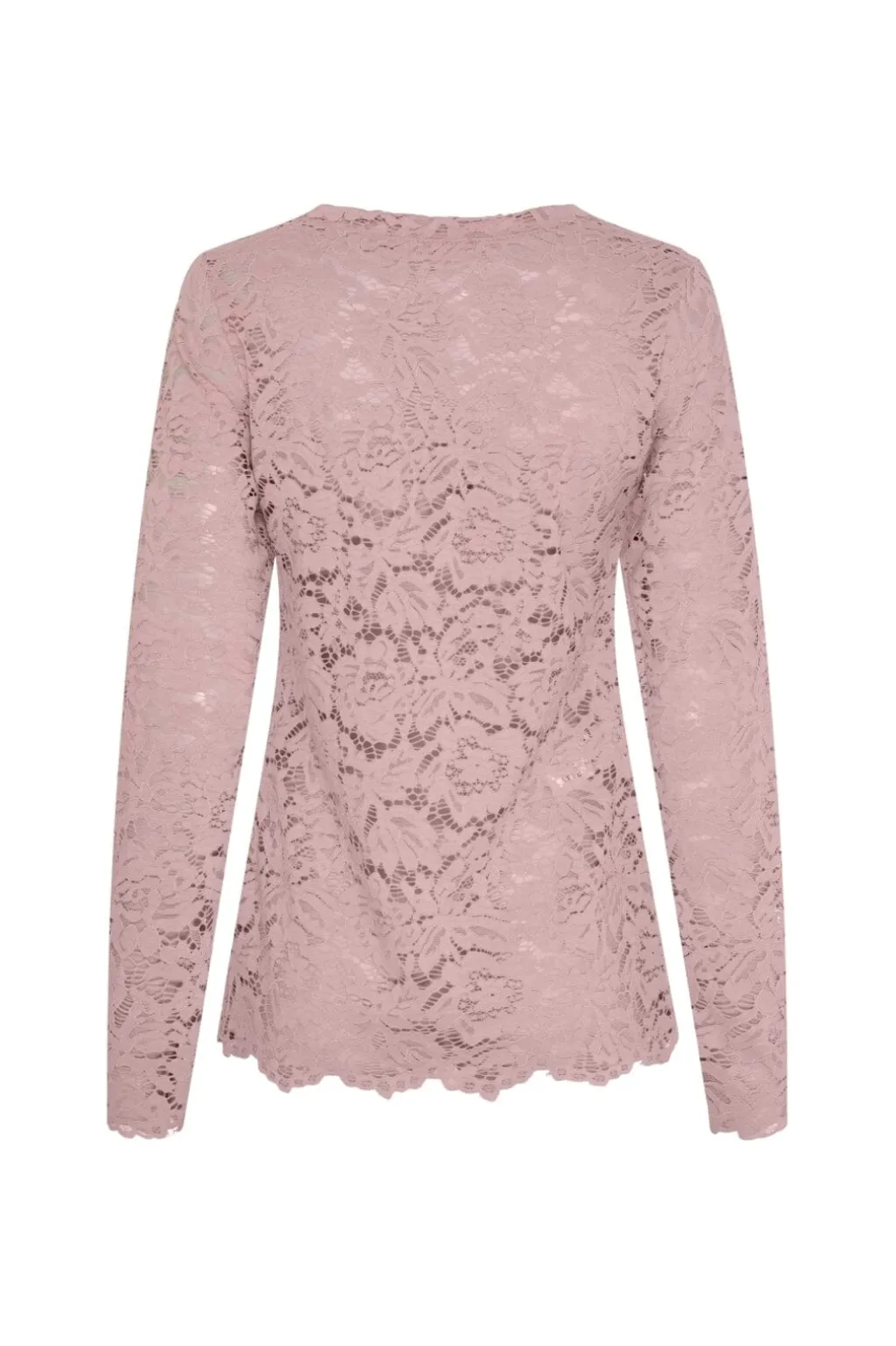 Pink bluse fra Marta Du Chateau med blondearbejde over hele blusen. Blusen har en rund halsudskæring og lange ærmer.