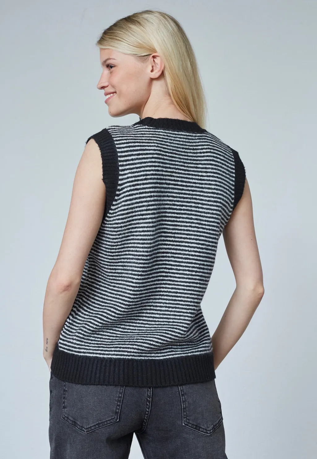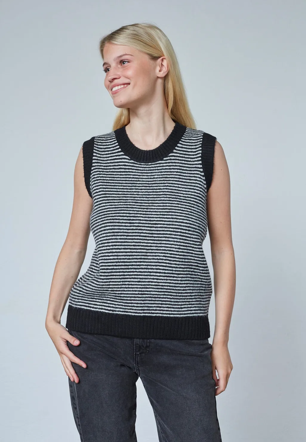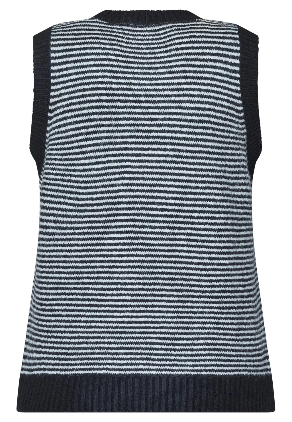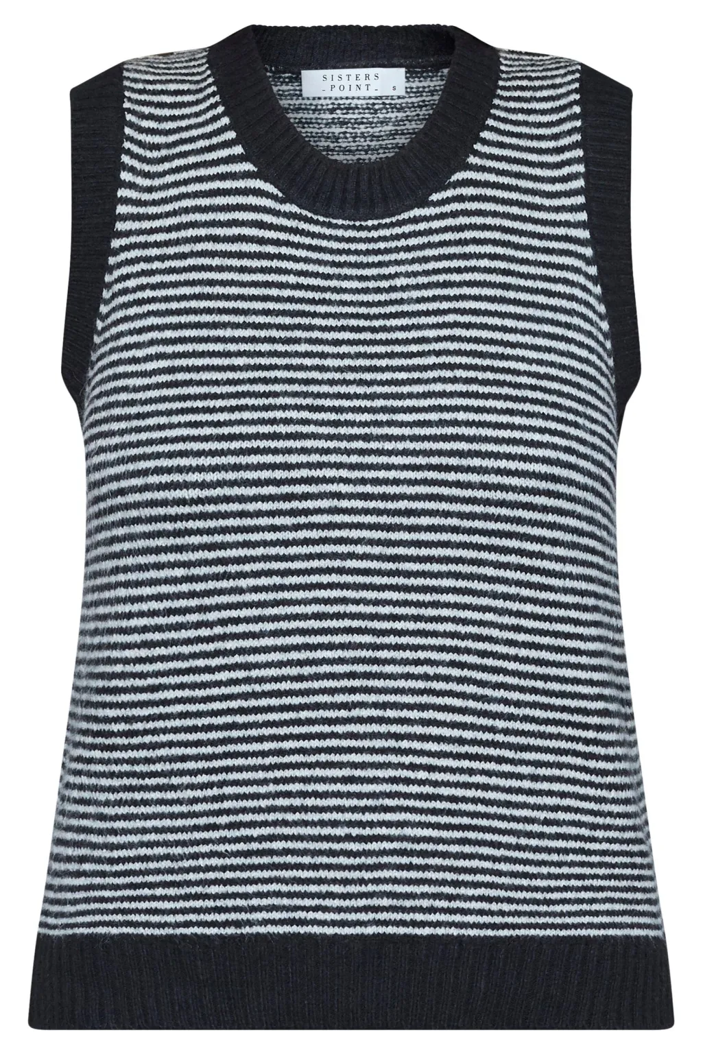 Sort og cremefarvet stribet vest fra Sisters Point. Vesten er ærmeløs og lavet af en blanding af akryl og polyester.