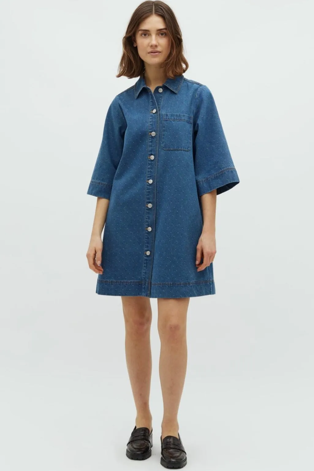 Denimkjole fra Global Funk med polkaprikker i blå nuancer. Kjolen har skjortekrave, knaplukning foran og en brystlomme samt 3/4-lange ærmer.