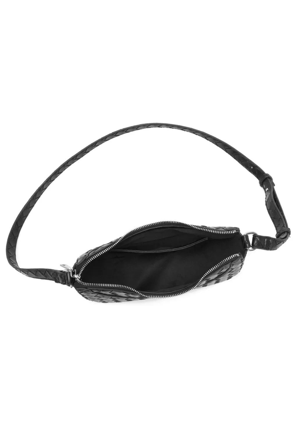 Sort taske fra Noella med et vævet mønster på overfladen. Tasken har en halvmåneformet silhuet og er lavet af 100 % polyurethan.