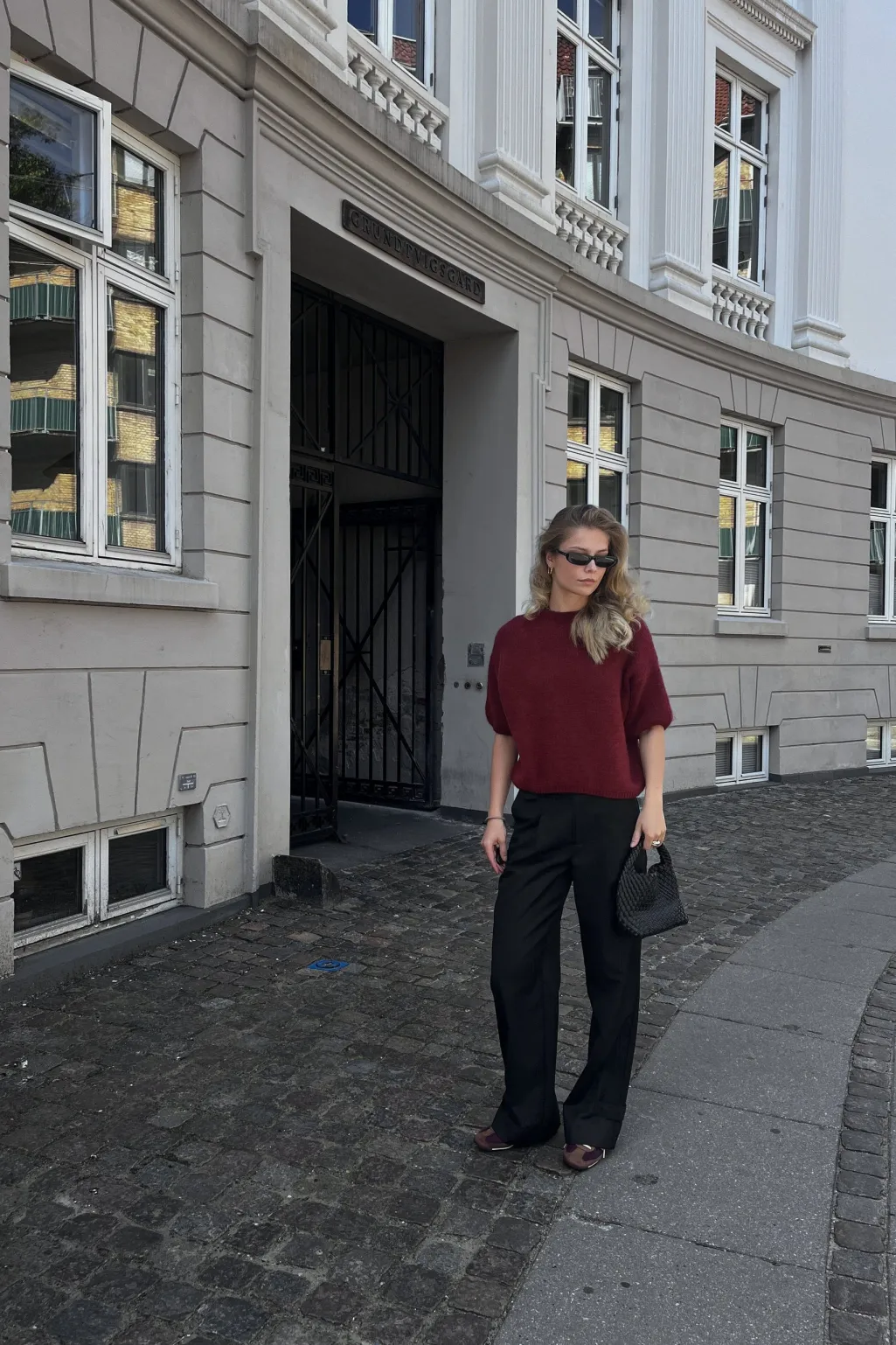 Strikket bluse fra Noella i farven Dusty Mahogany, en mørk rød nuance med brune undertoner. Blusen har en løs pasform og trekvartærmer.