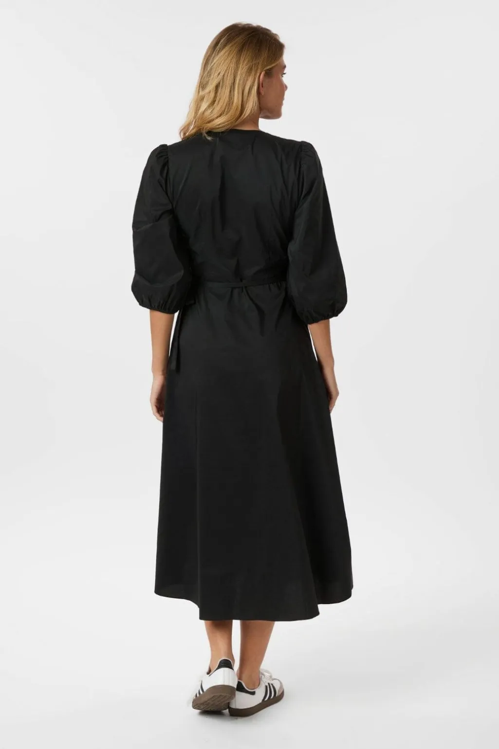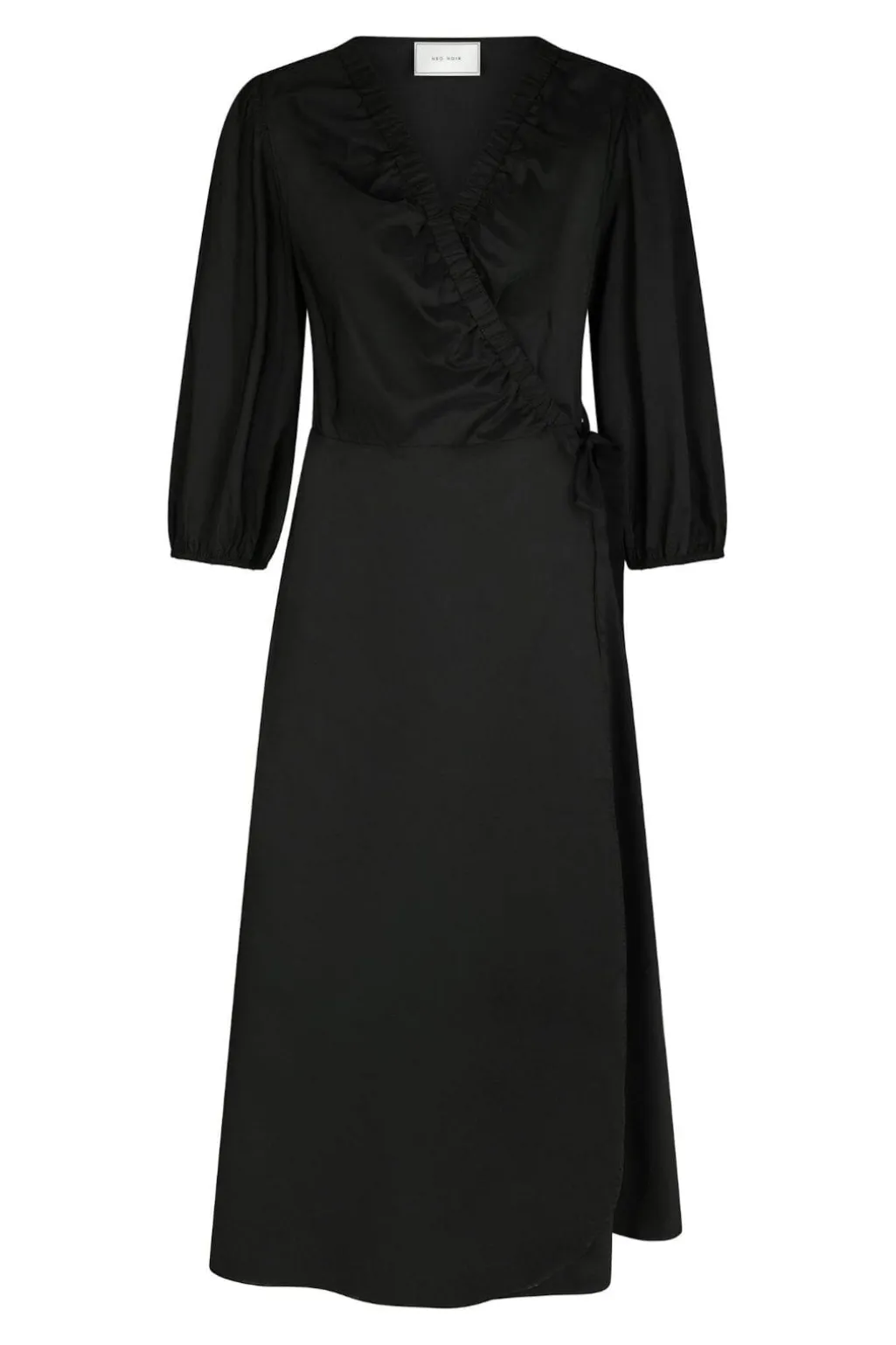 Sort poplin-kjole fra Neo Noir med slå-om-design og V-hals. Kjolen har rynkedetaljer ved udskæringen og et bindebånd i taljen.