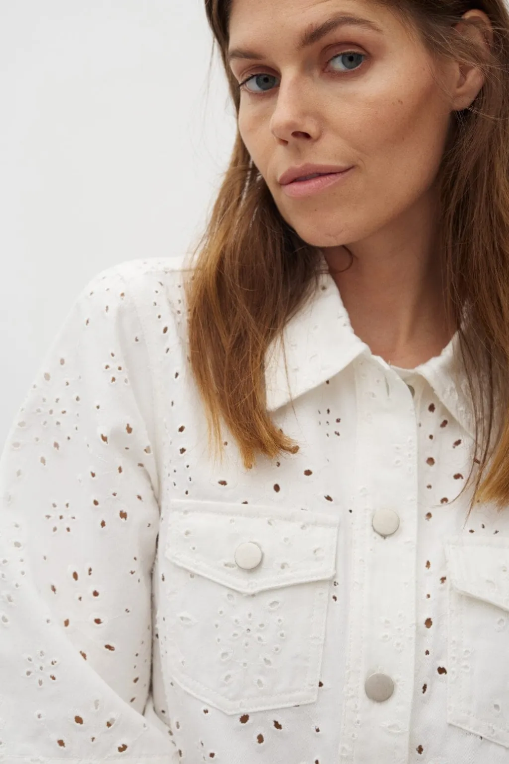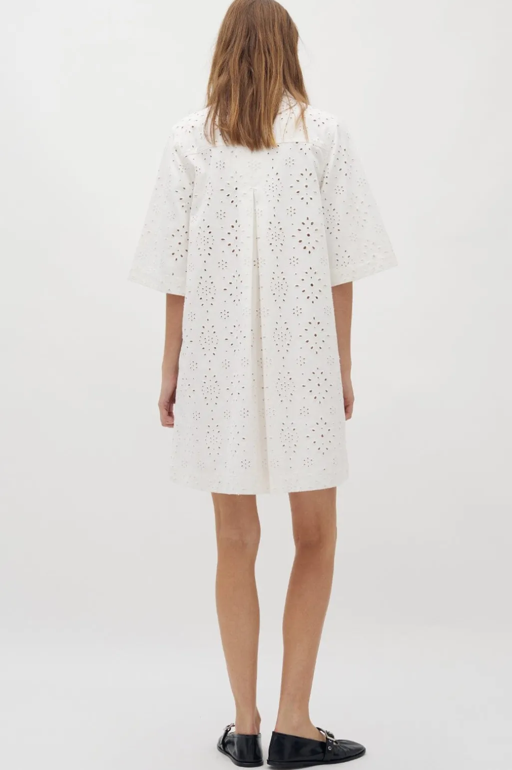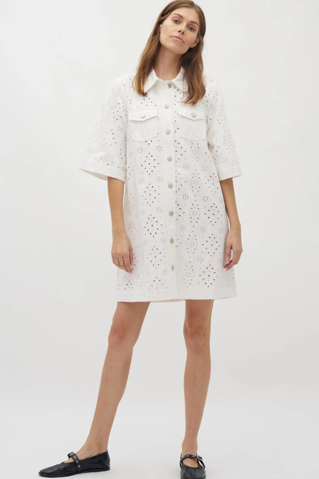 Hvid kjole fra Global Funk med broderi og hulmønster. Kjolen har skjortekrave, 3/4 ærmer og knaplukning foran. Det lette bomuldsstof har et gennemgående mønster af små huller.