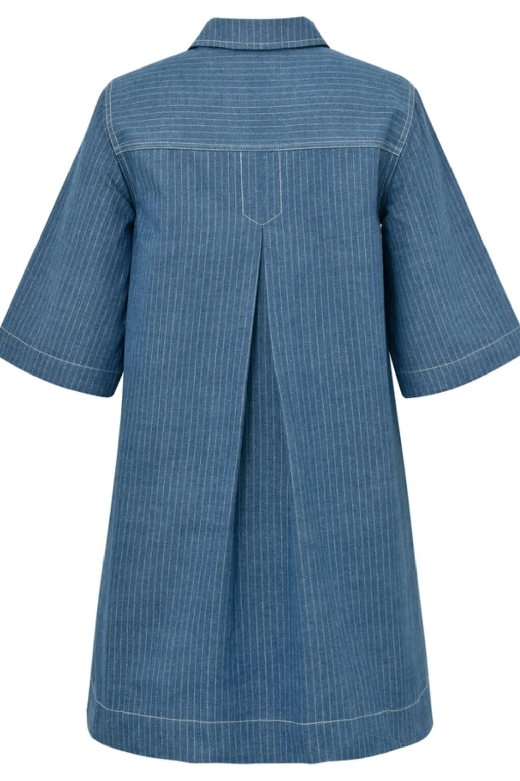 Blå kjole fra Global Funk med pinstriber. Kjolen har skjortekrave, korte ærmer og lynlås foran. Det blå stof har et klassisk stribemønster.