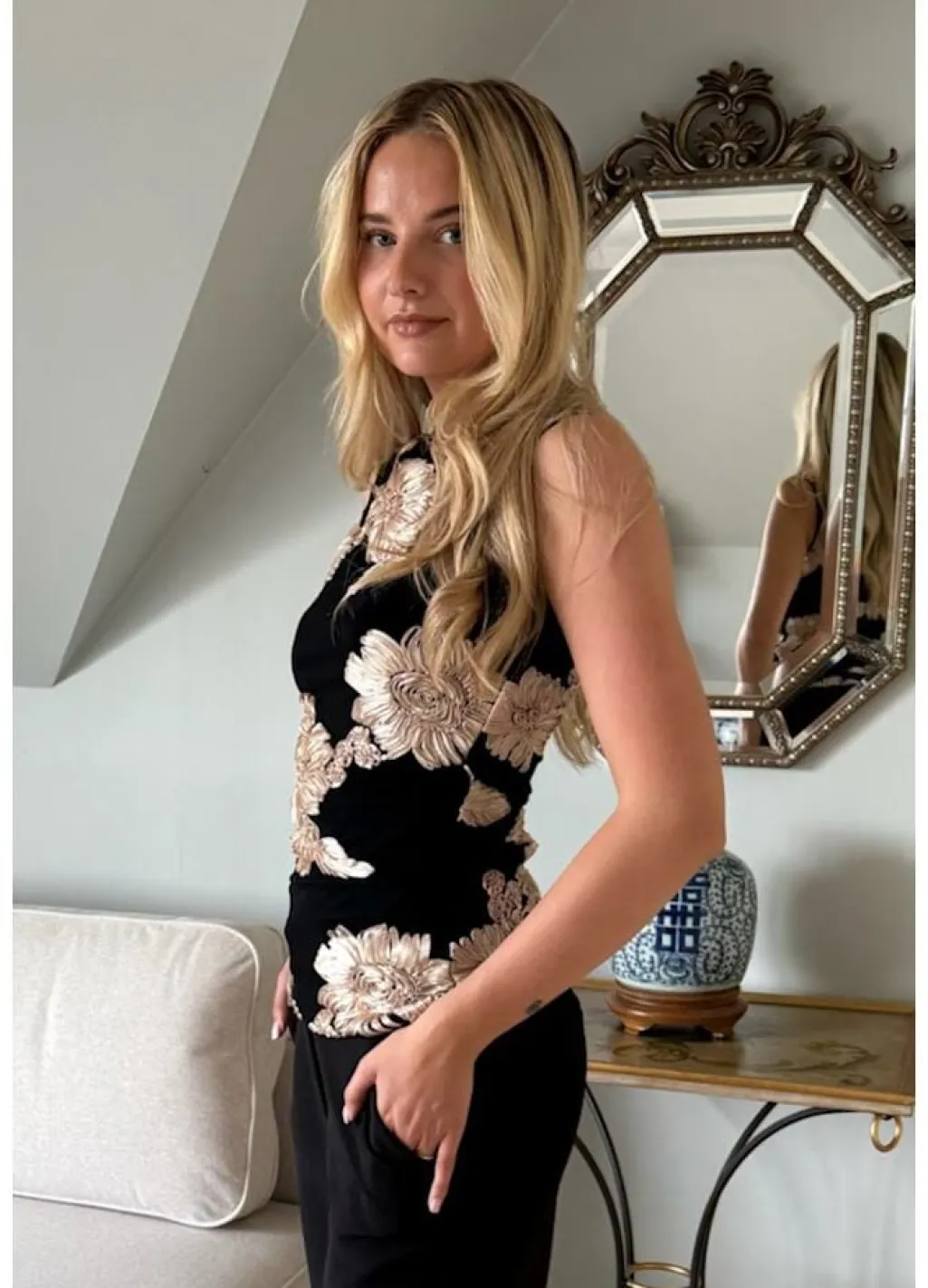 Sort mesh-top fra BYIC med broderede blomster i beige. Toppen har 3D-blomsterdetaljer og flæser ved skuldrene, der skaber et unikt design med rynkedetaljer på siderne.