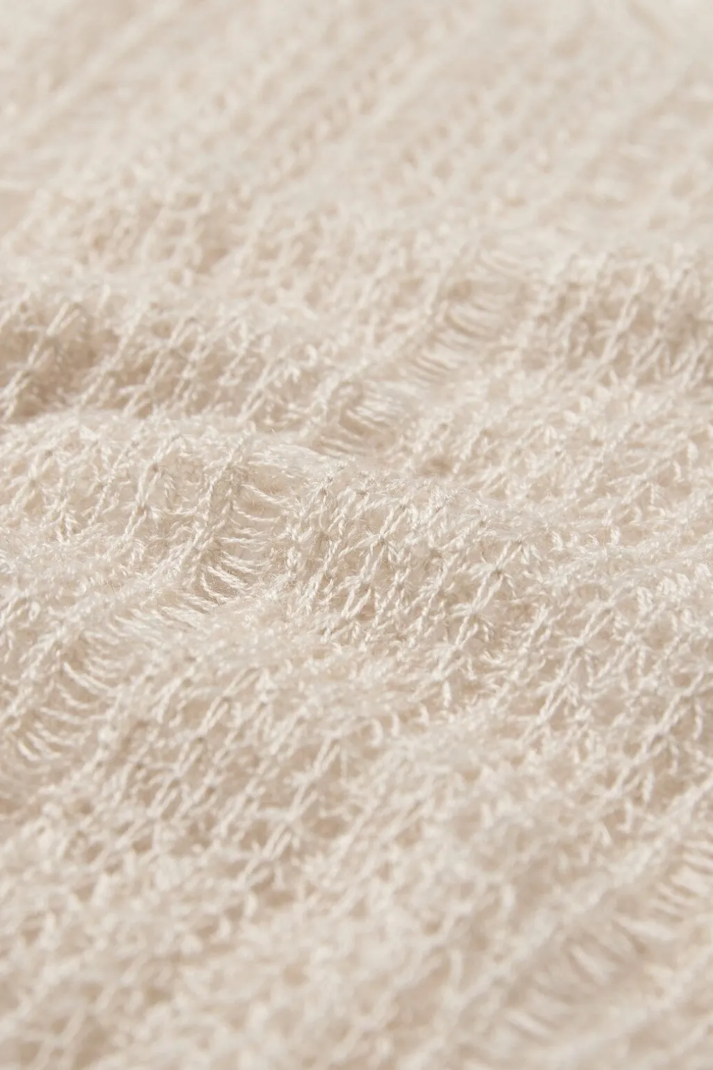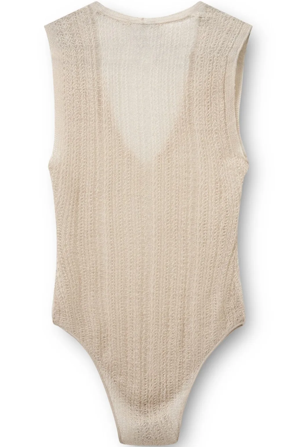 Strikket bodystocking fra H2O i en neutral greige farve. Den har en dyb V-udskæring både foran og bagpå samt et ærmeløst design med strikket tekstur.