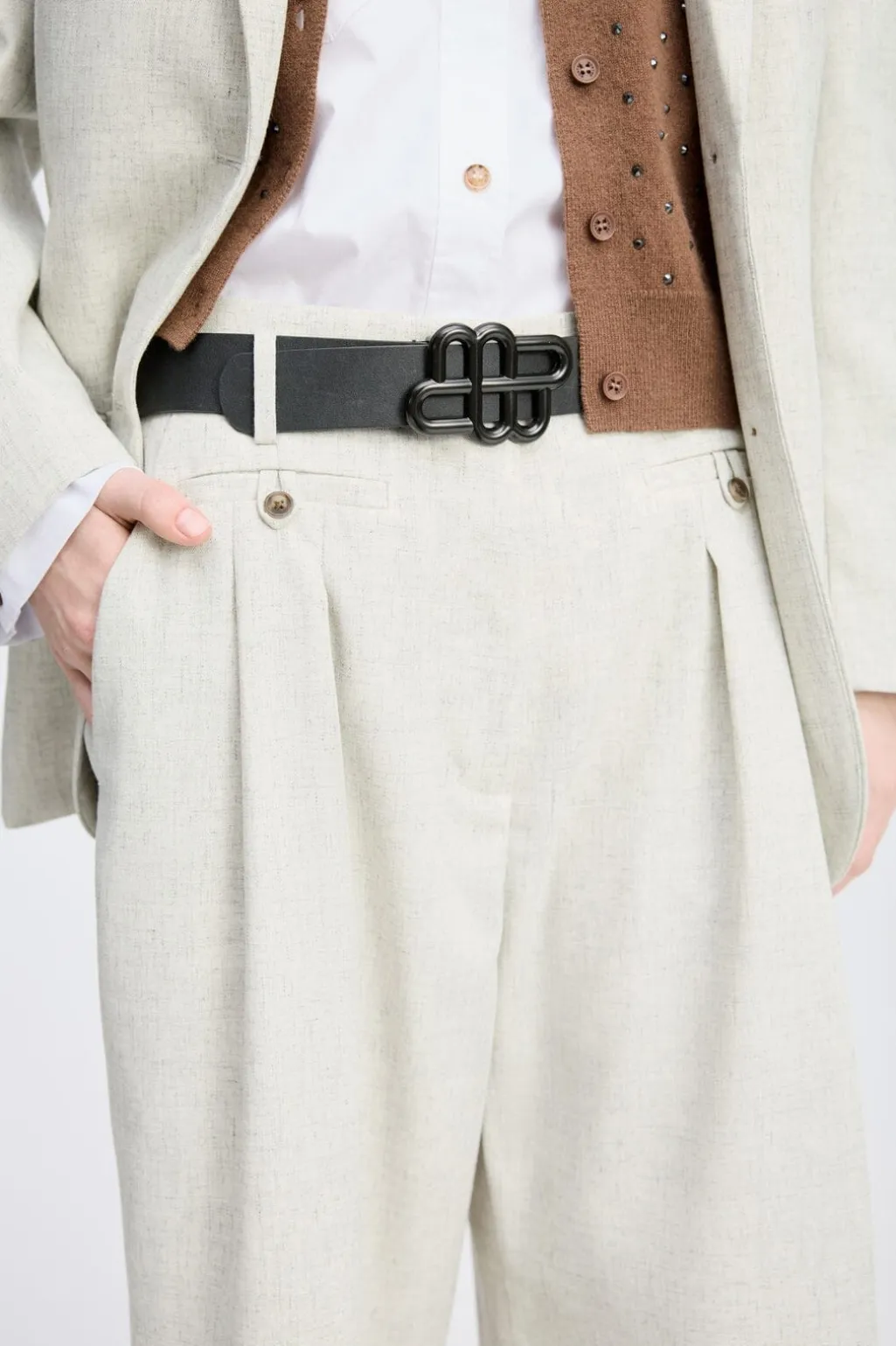 Sort bælte fra Munthe i glat læder med en karakteristisk spænde. Bæltet har et stilrent design med MUNTHE-emblem på spændet.