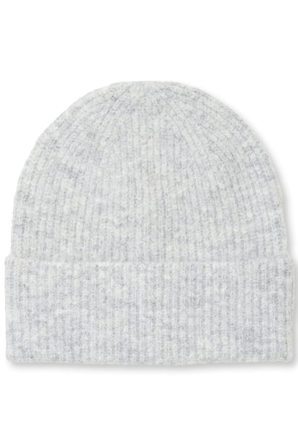 Lys grå meleret hue fra MbyM med ribbet tekstur og foldet kant. Huen er strikket i en blanding af syntetiske og naturlige fibre.