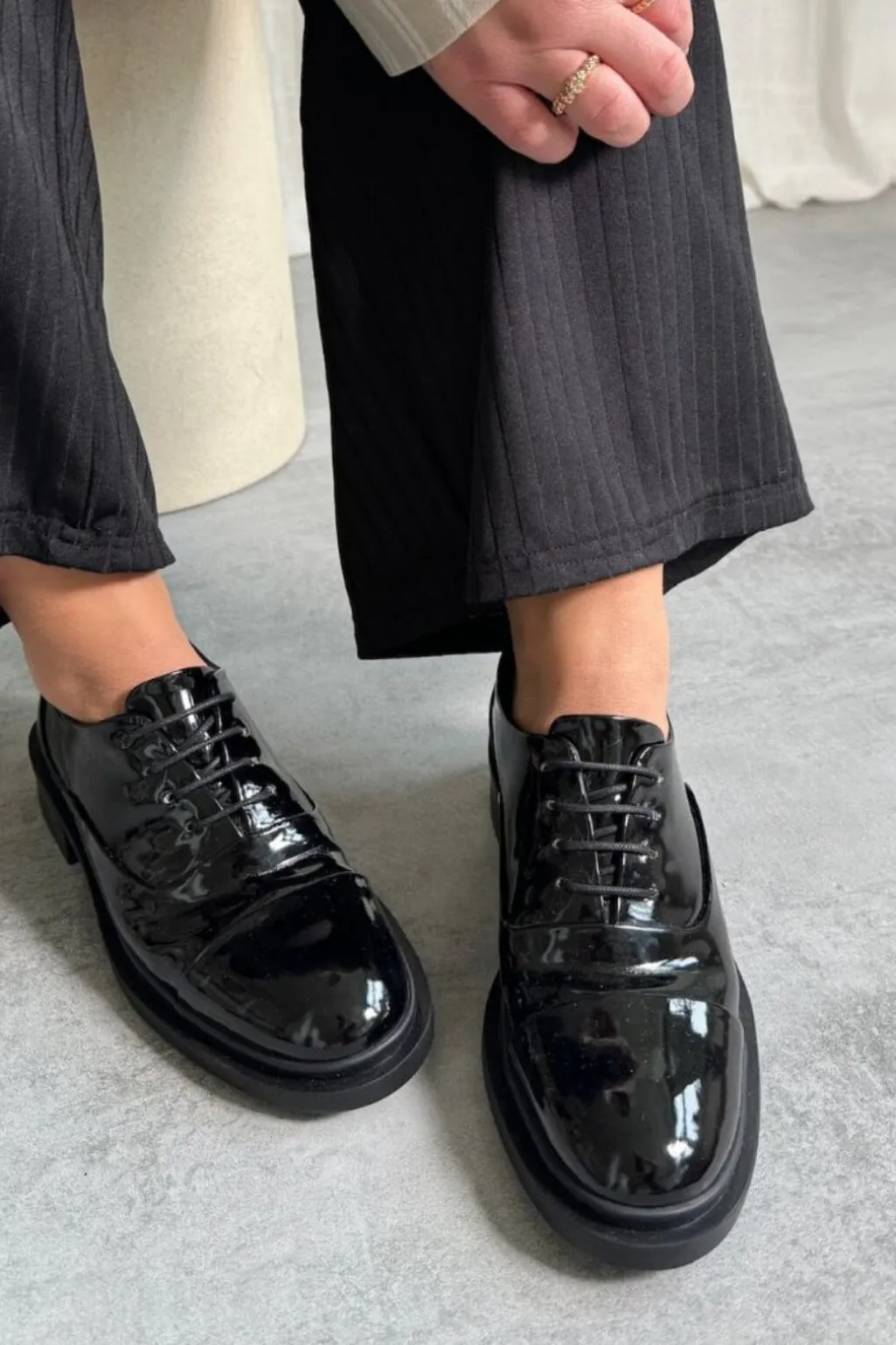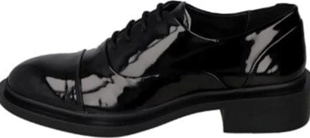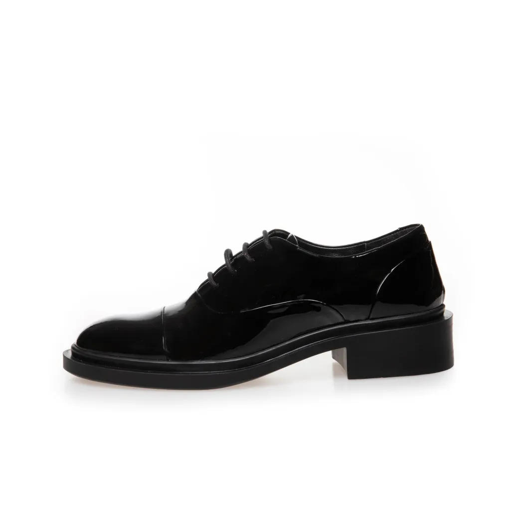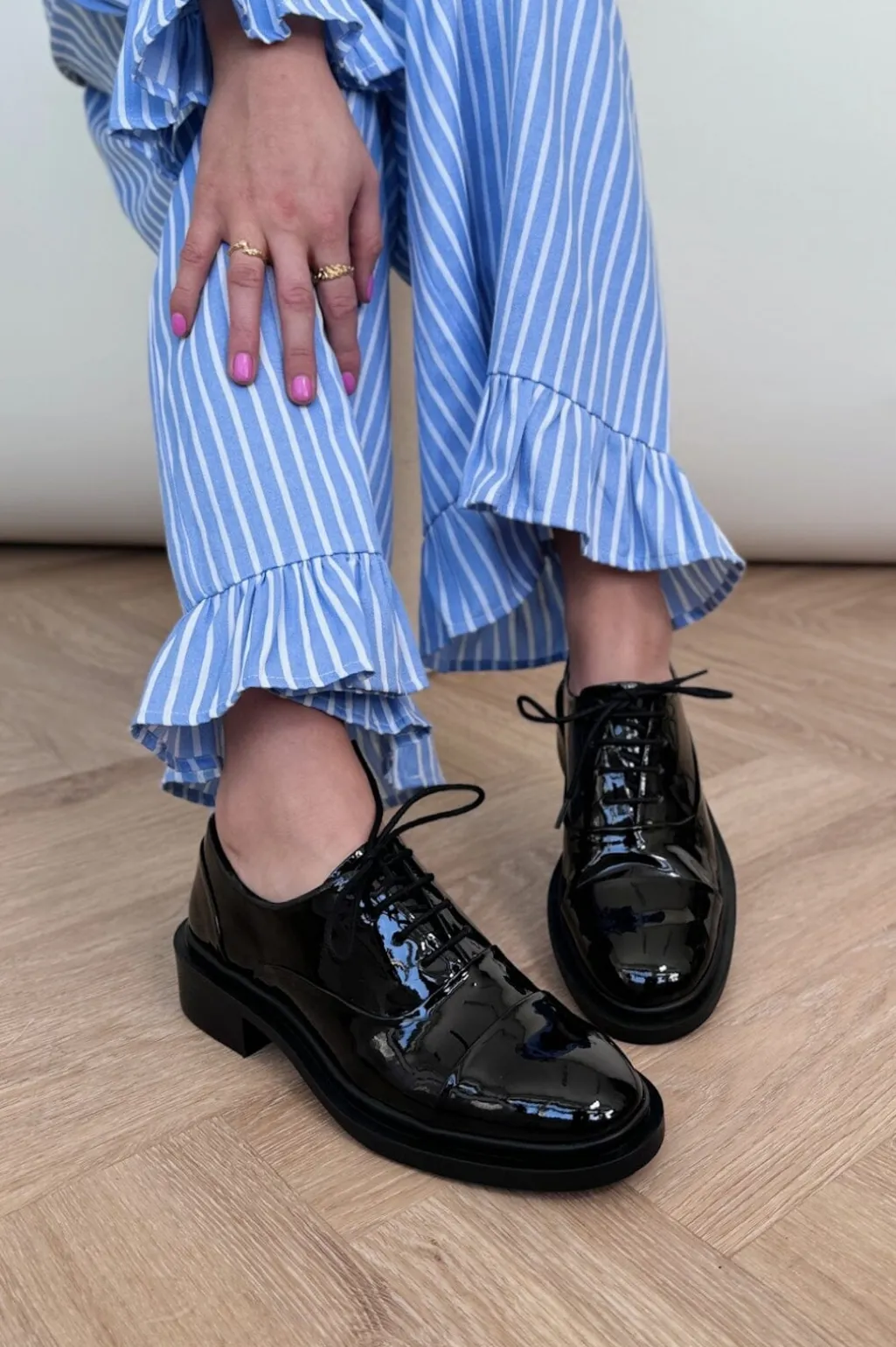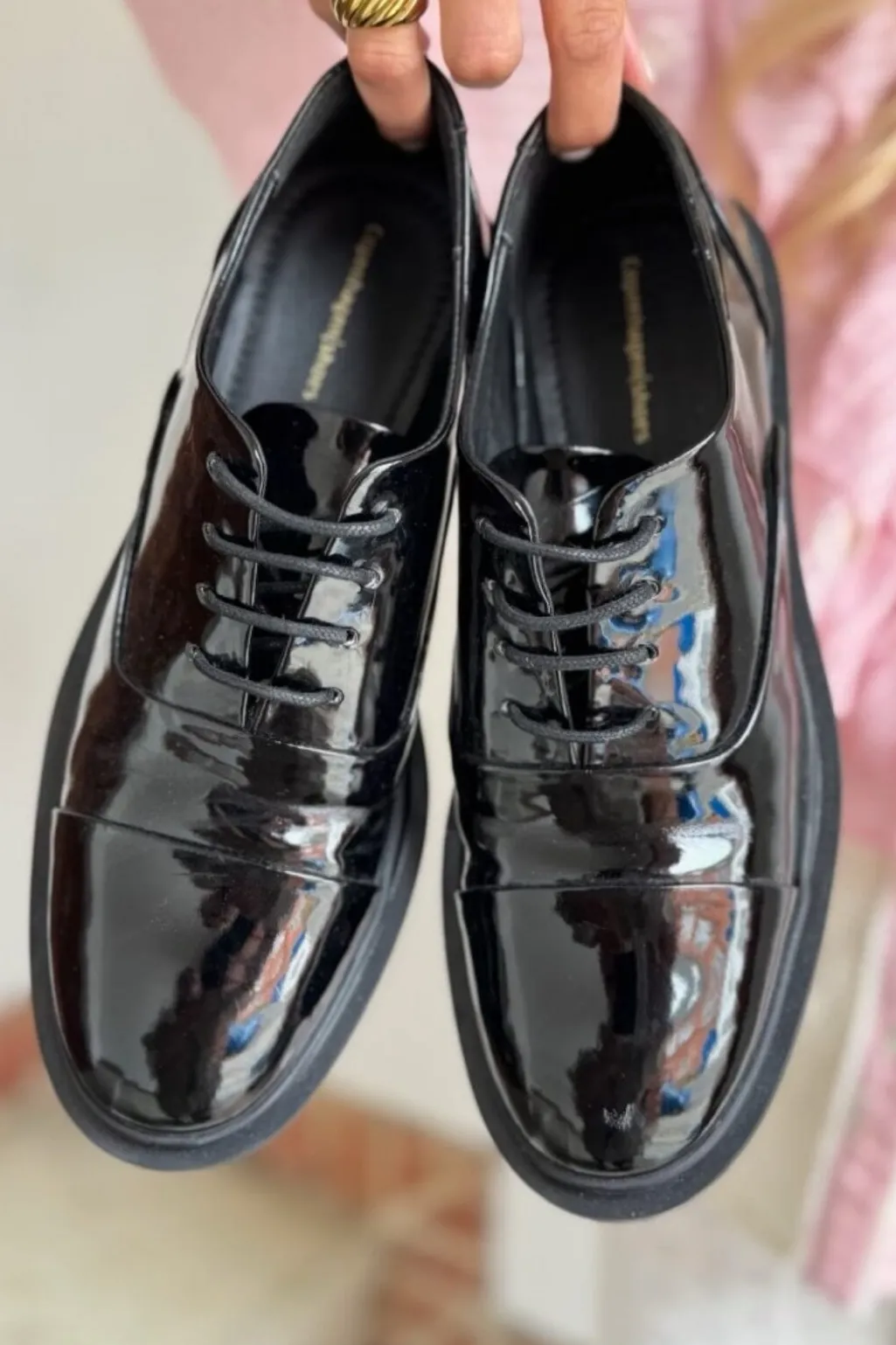 Sorte patentlædersko fra Copenhagen Shoes med snørebånd. De blanke sko har en lav blokhæl og firkantet tå.