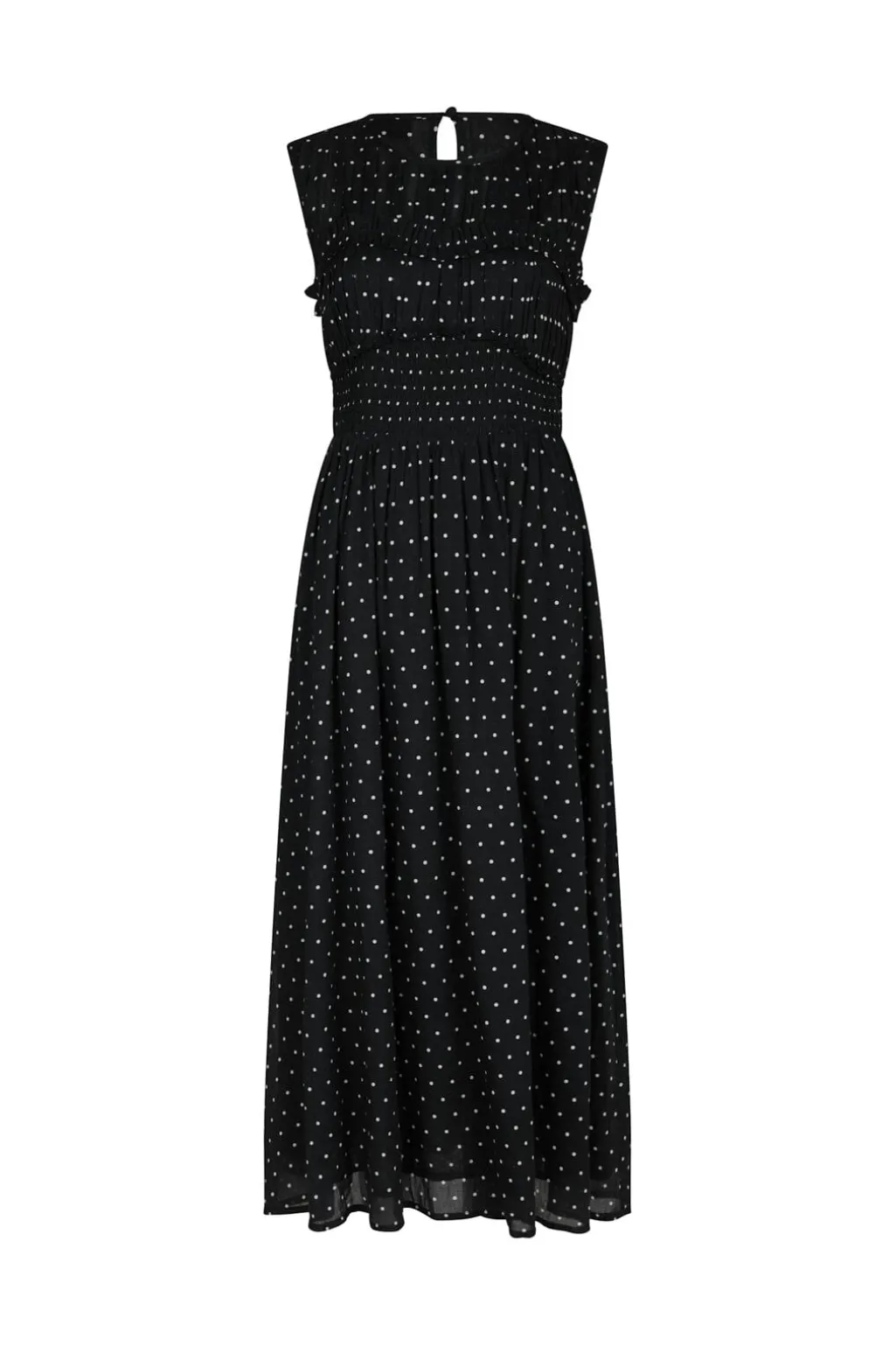 Sort kjole fra Neo Noir med hvidt prikket mønster. Kjolen er lang og ærmeløs med flæsedetaljer og en elastisk talje.