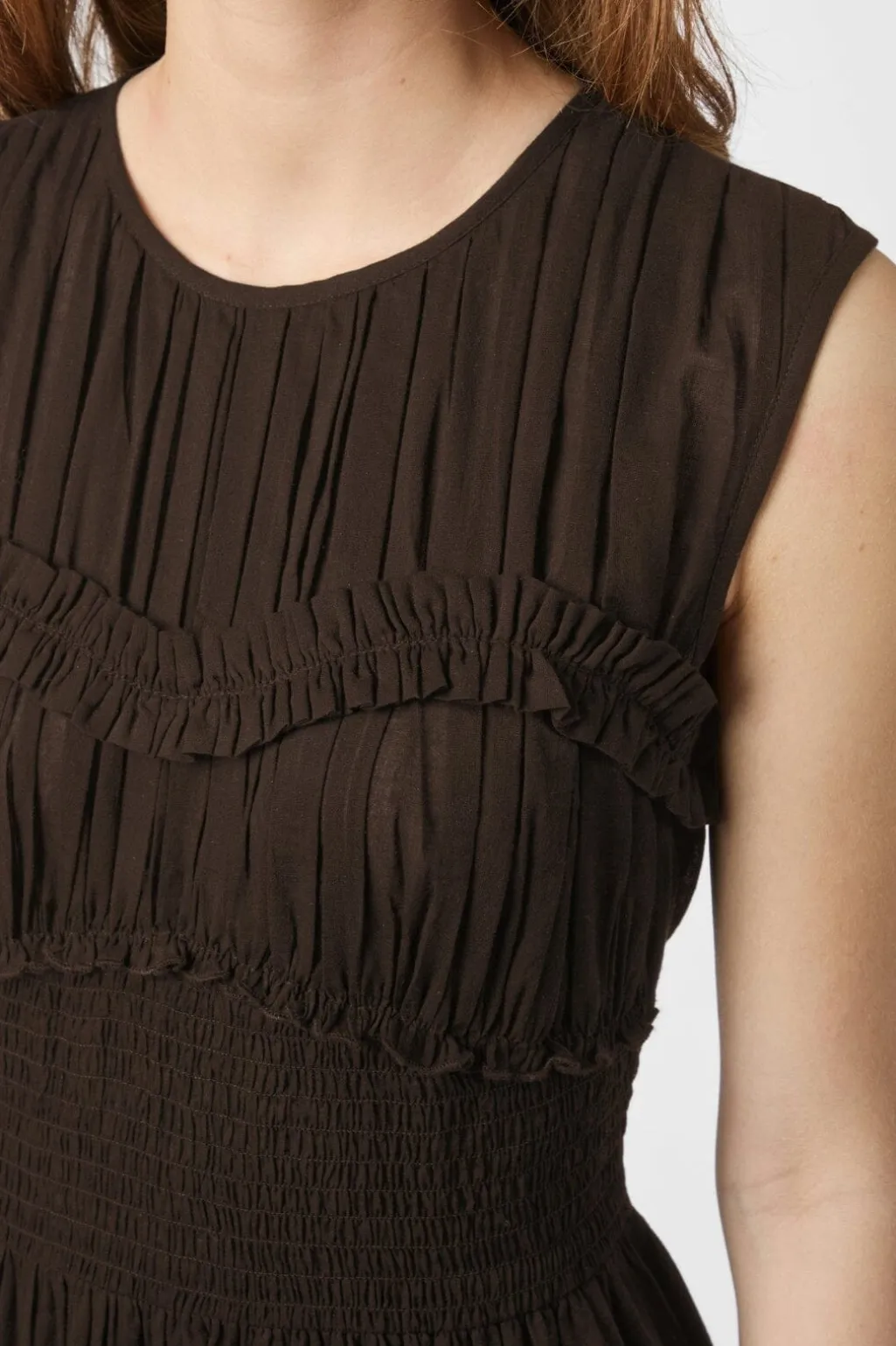 Mørkebrun kjole fra Neo Noir i voile. Kjolen har en smock-detalje på overdelen og en knaplukning i nakken, der giver den et enkelt og rent udtryk.
