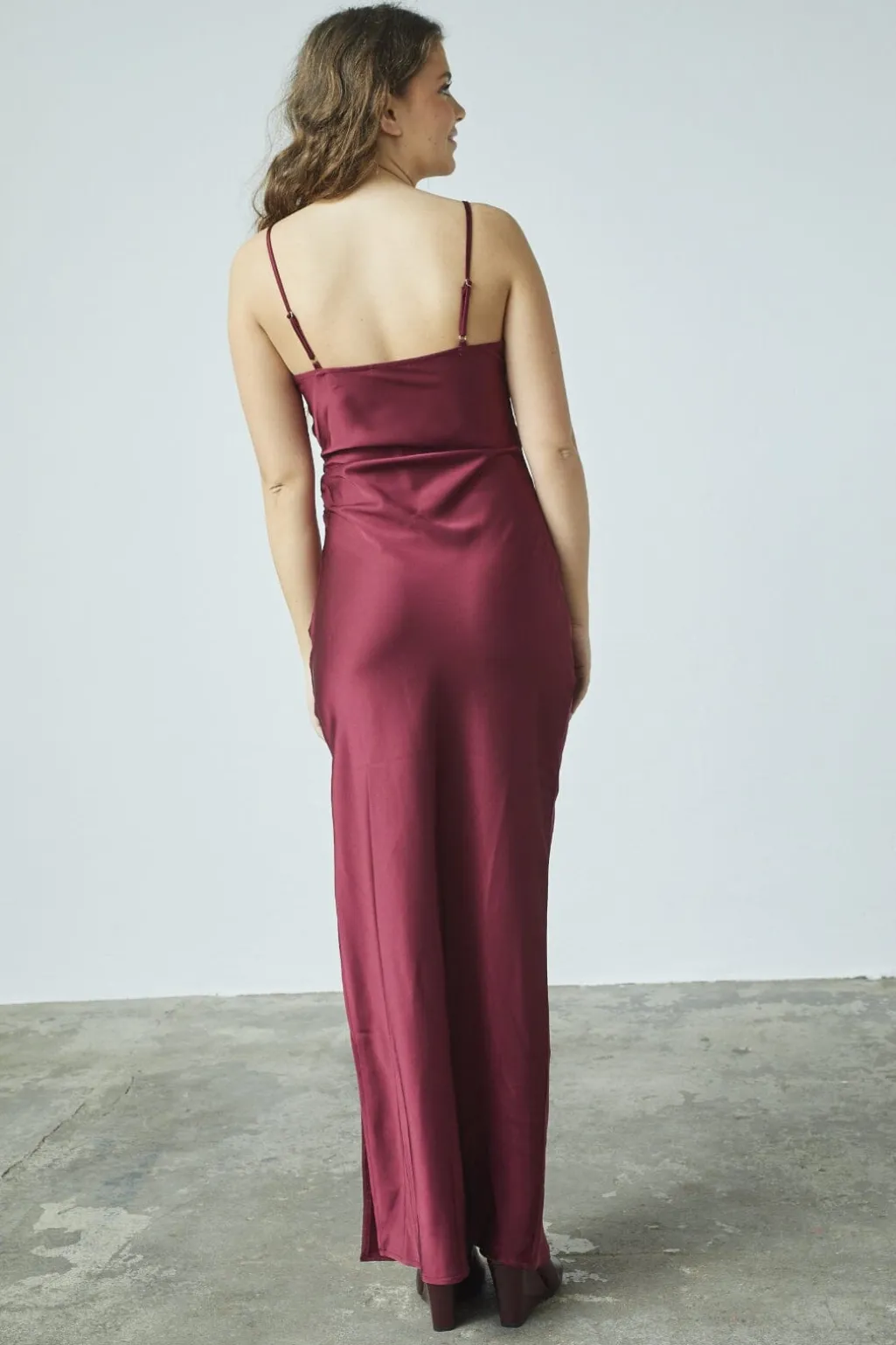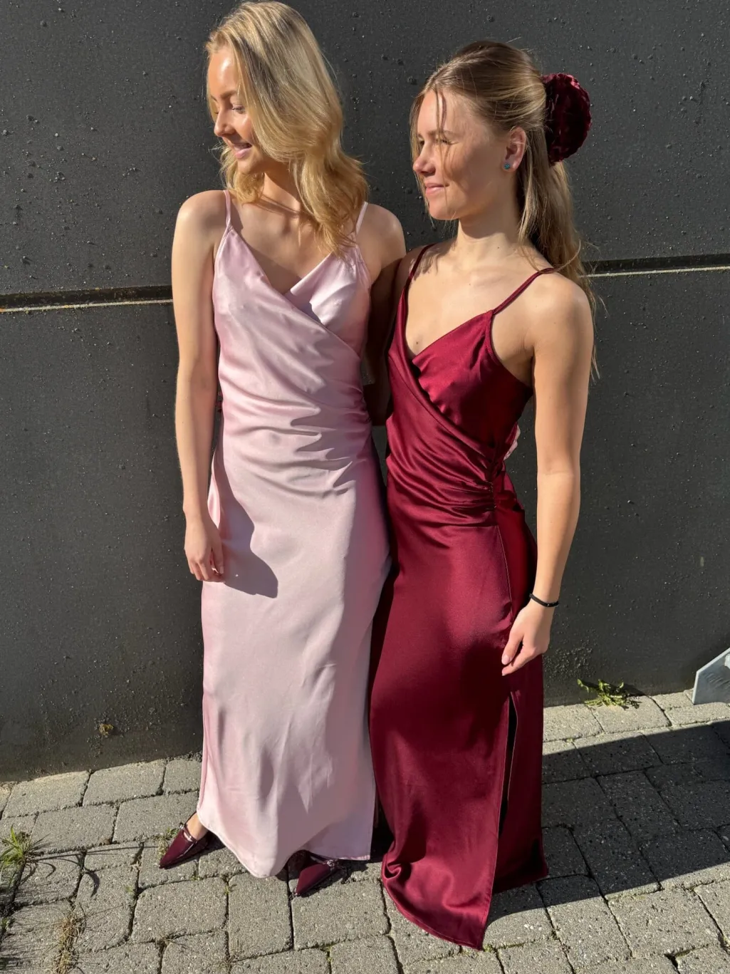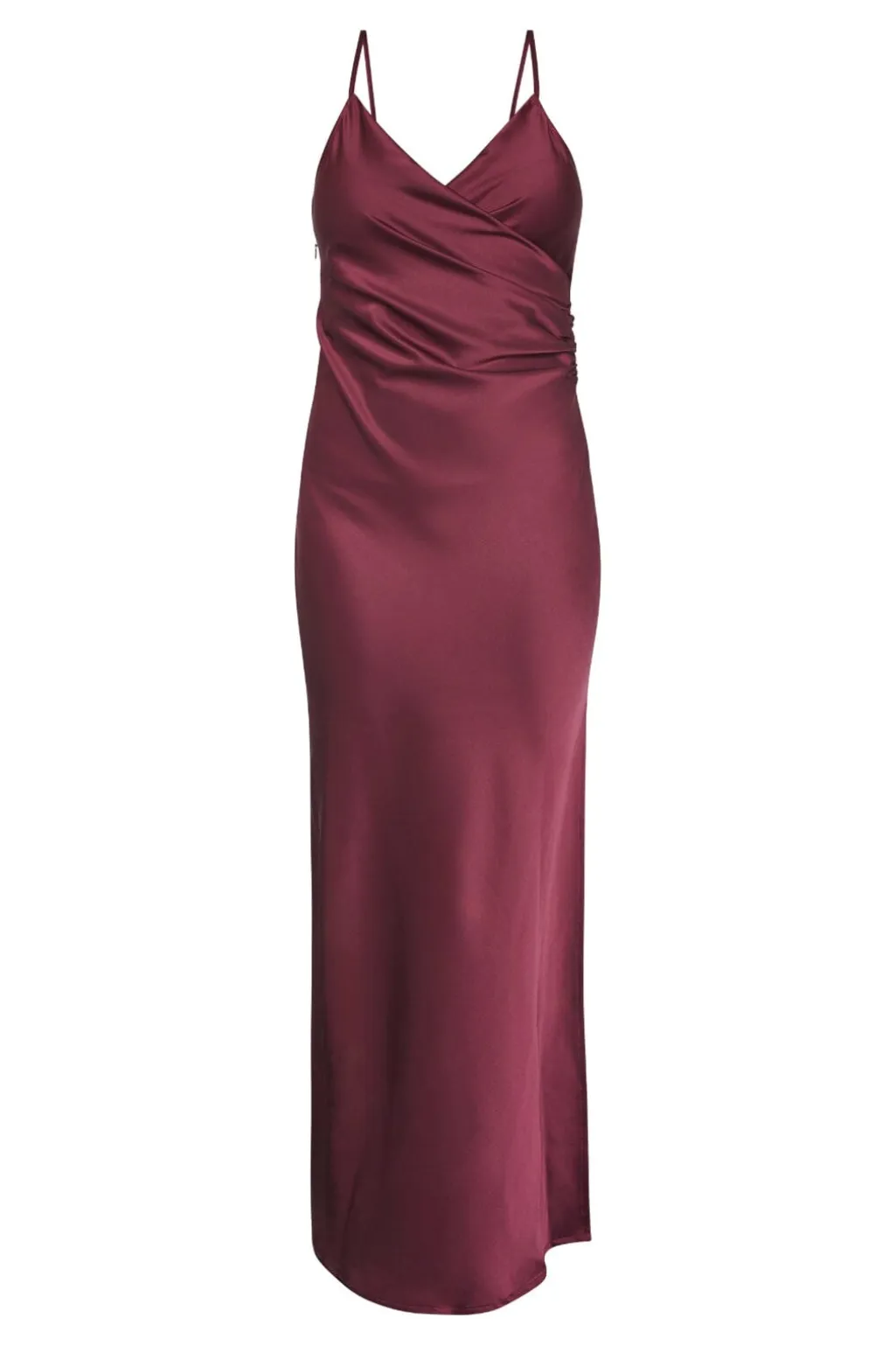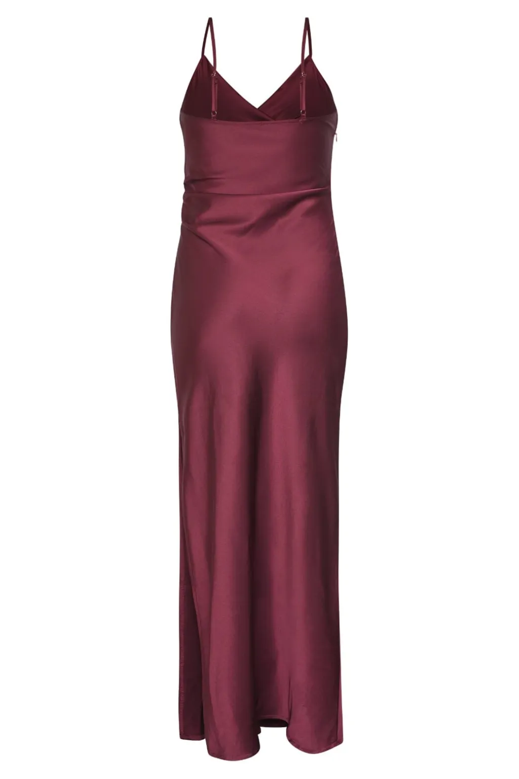 Lang burgunderrød kjole fra Sisters Point med satinlignende overflade. Kjolen har tynde, justerbare stropper, v-udskæring og en slids i siden.