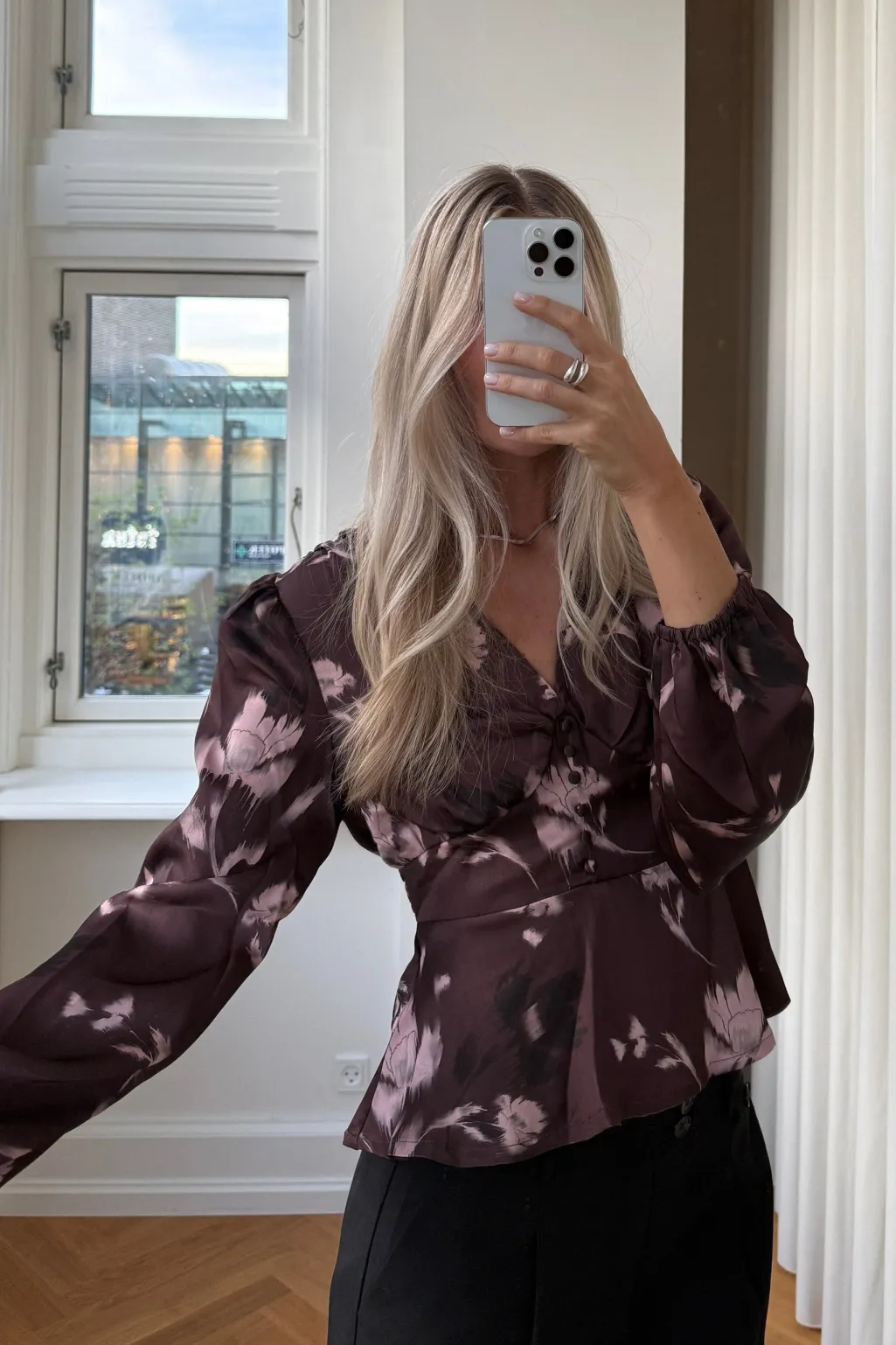 Bluse fra Noella med blomsterprint i bordeaux og lyserøde nuancer. Blusen passer til både afslappede hverdage og festlige lejligheder.