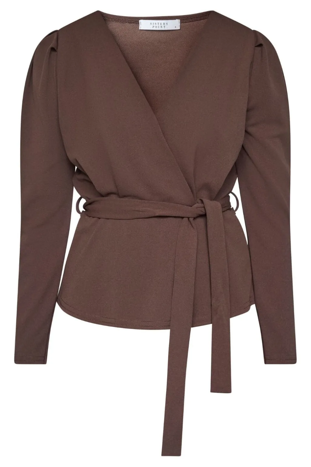 Brun bluse fra Sisters Point med wrap-design og bælte i taljen. Blusen har en dyb V-hals og lange ærmer med let puffede skuldre.