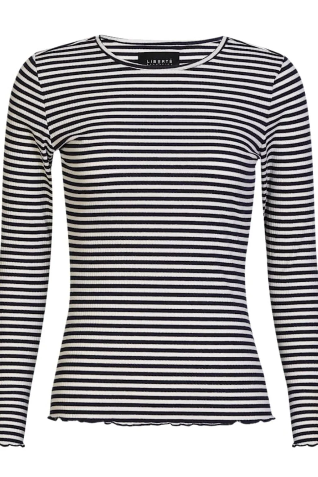 Stribet bluse fra Liberte i 95% viskose og 5% spandex. Blusen har striber i mørkeblå, creme og guld.