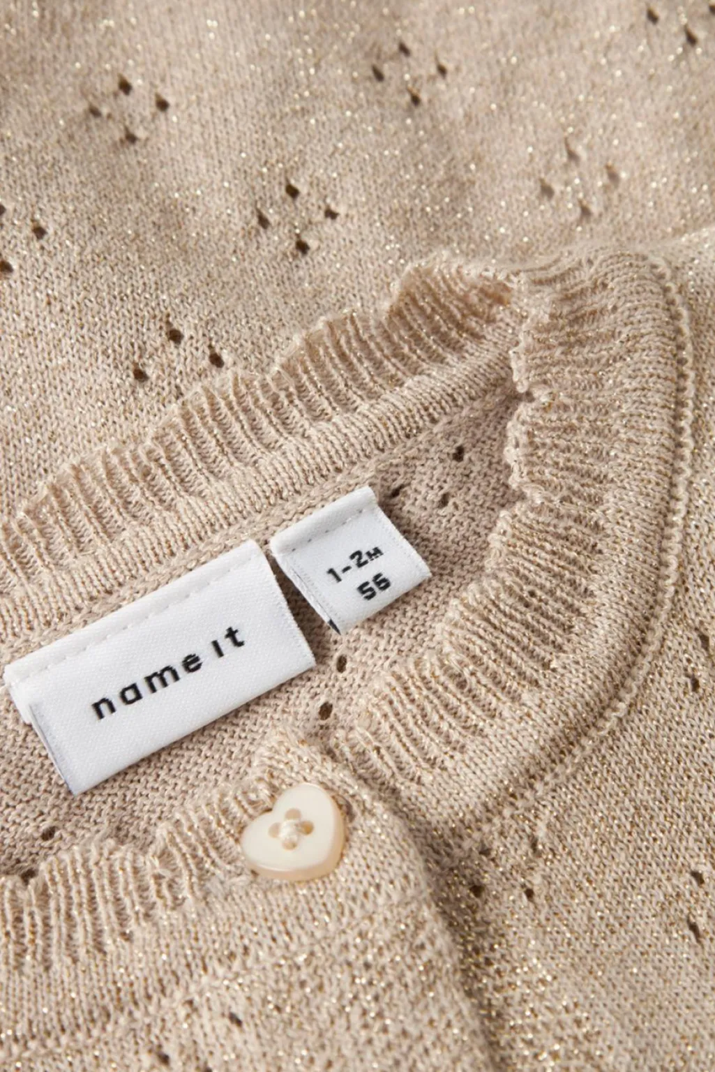 Strikket cardigan fra Name It i cementfarvet bomuld med metalliske fibre. Den har dekorative huller i strikken og ribkant langs ærmerne og forneden.