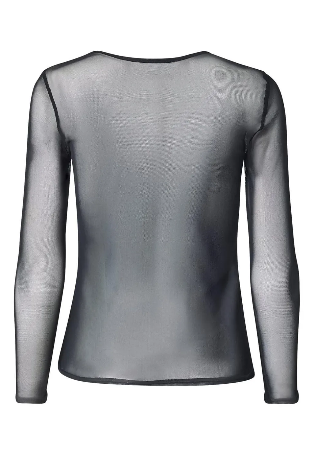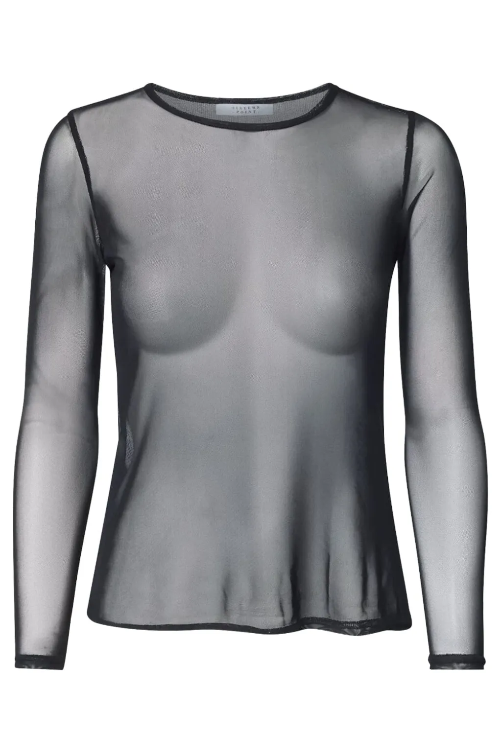 Sort meshbluse fra Sisters Point med transparent design. Blusen har lange ærmer og en rund halsudskæring. Den passer til både hverdag og fest.