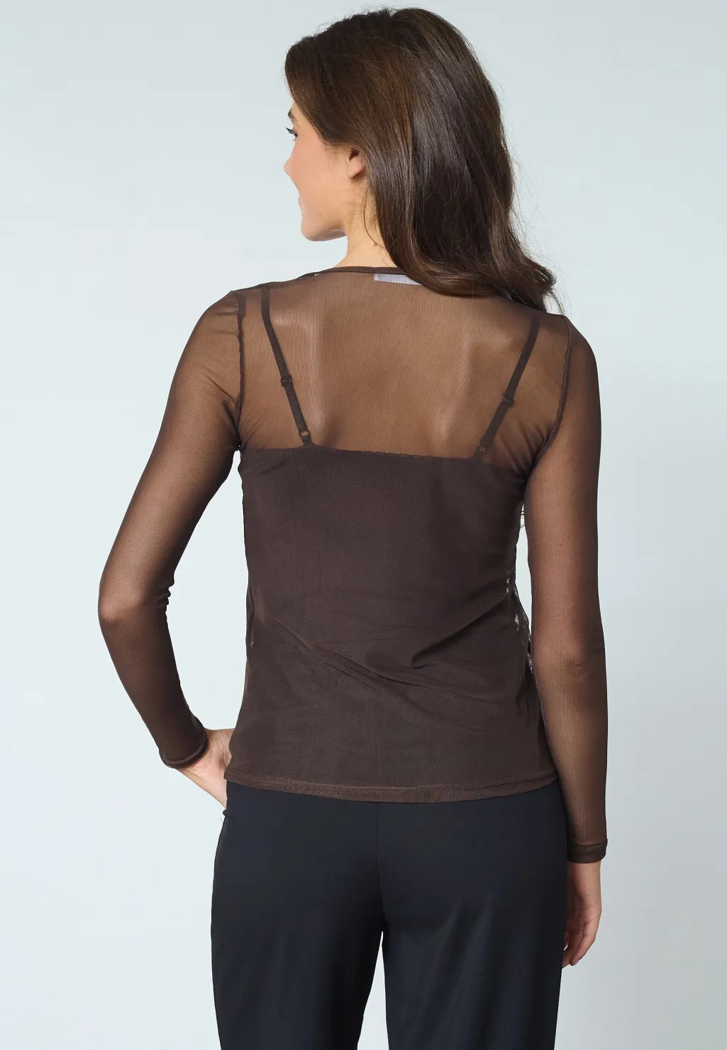 Transparent mesh-top fra Sisters Point i en mørk chokoladebrun farve. Toppen har lange ærmer og en rund halsudskæring.