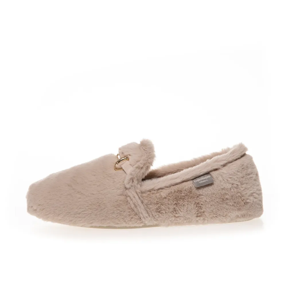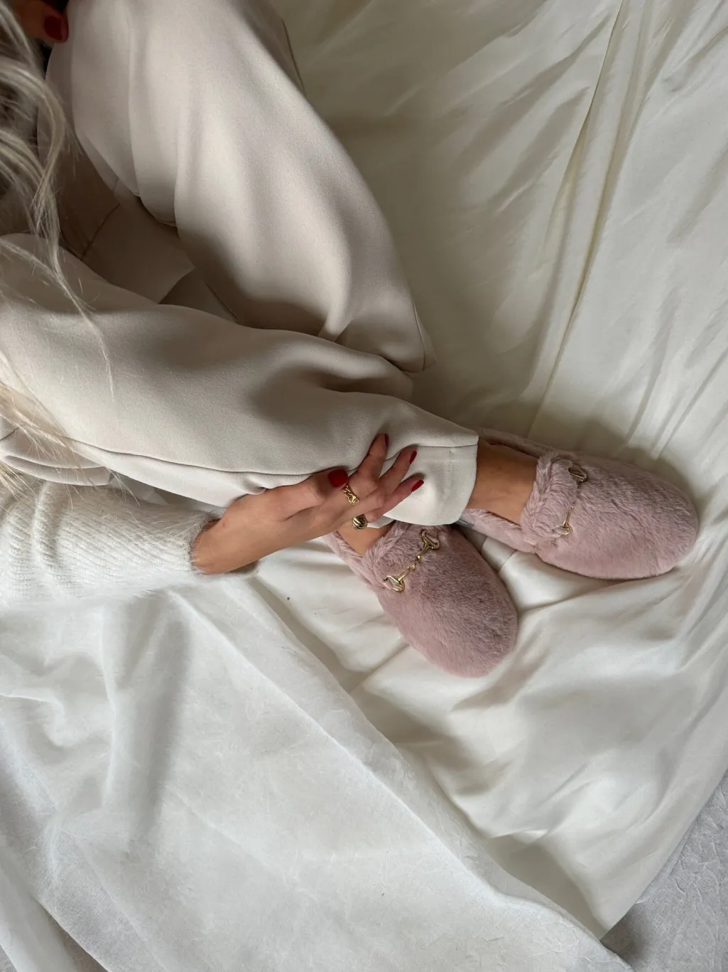 Rosa hjemmesko fra Copenhagen Shoes med fluffy tekstilmateriale. Designet har en dekorativ guldkæde på oversiden og en lav hæl til behagelig brug i hjemmet.