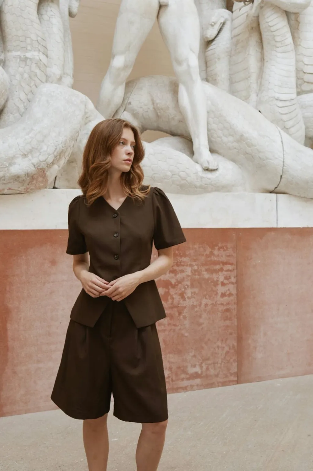 Mørkebrune shorts fra Neo Noir med brede ben og læg foran. Shortsene har en høj talje og en løs pasform, der giver god bevægelsesfrihed.