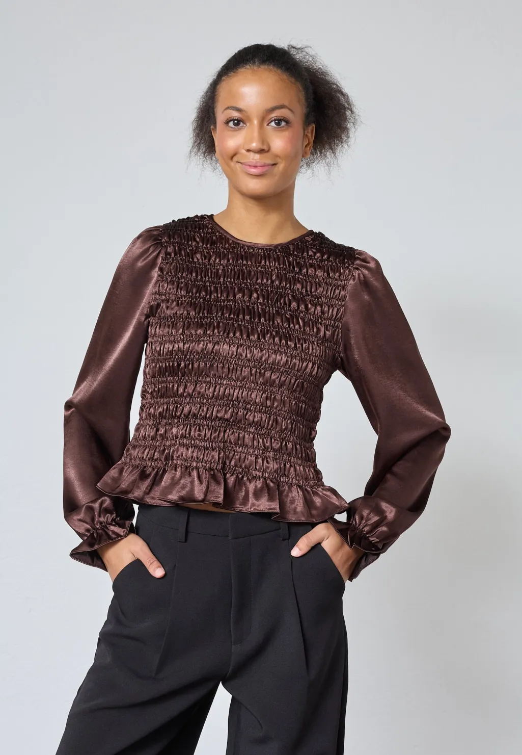 Brun bluse fra Sisters Point, lavet af satinmateriale. Blusen har rund halsudskæring, lange ærmer med let puffet effekt og tæt smock over brystet og ryggen.