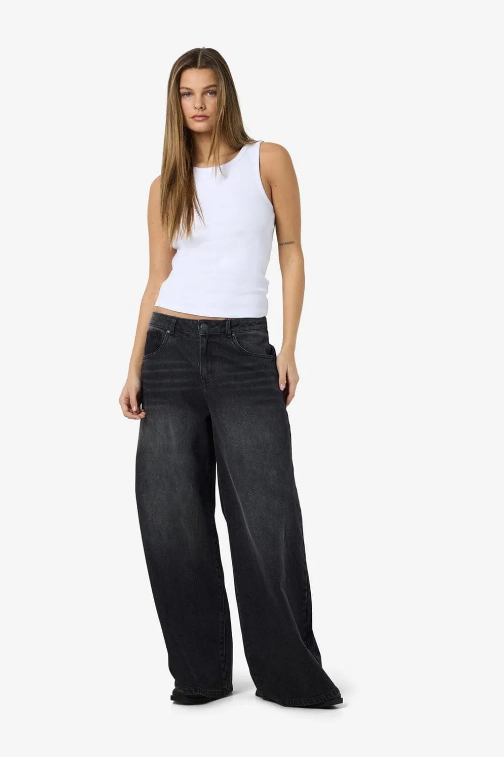 Hvid tanktop fra Noisy May med tætsiddende pasform. Det enkle design gør den nem at style til både afslappede og mere formelle anledninger.