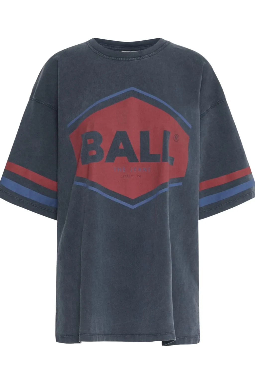 T-shirt fra Ball i mørkeblå med røde og blå striber på ærmerne. Forsiden har et stort Ball-logo samt teksten THE JEANS og ITALY 74 i et grafisk design.