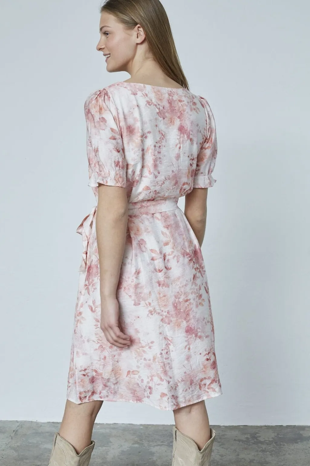 Knælang kjole fra Sisters Point i hvid med lyse koralblomster. Kjolen har puffede ærmer og rund halsudskæring samt et bindebånd i taljen, der kan justeres.