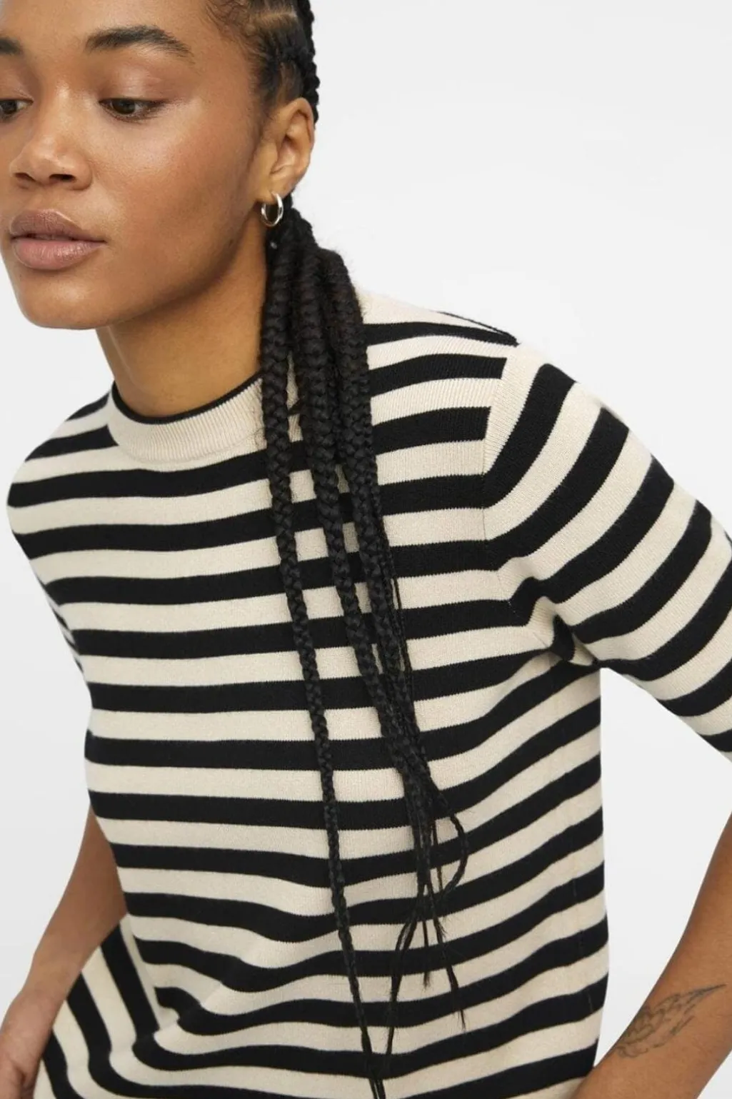 Striktrøje fra Object med korte ærmer i netmønstret strik. Den har striber i sandfarvet og sort, rund hals og en regular pasform. Strikken har en naturlig stræk i materialet.