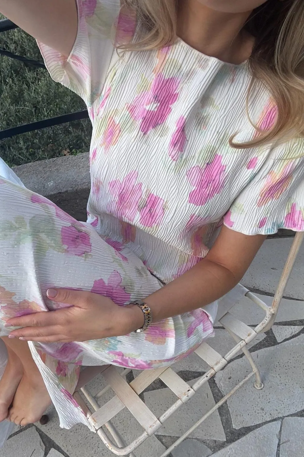 BYIC kjole i hvid med lyserødt blomsterprint. Kjolen har en længde til læggene og slids i begge sider. De korte ærmer har flæsedetaljer, og halsudskæringen er rund.