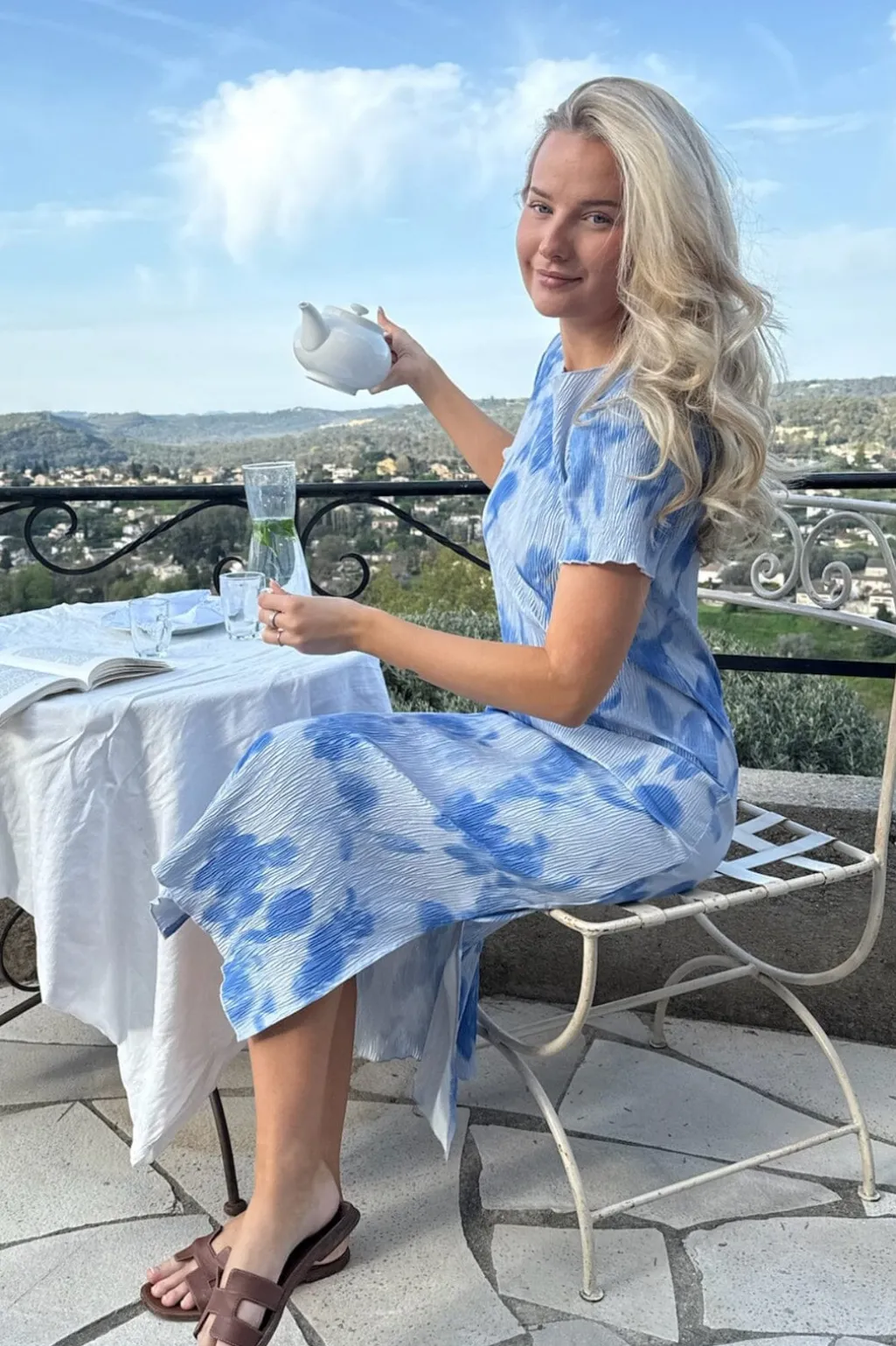 Kalvelang kjole fra BYIC i plisseret stof med lyseblå bundfarve og abstrakt blomstermønster. Kjolen har rund halsudskæring, korte ærmer og flæsedetaljer.
