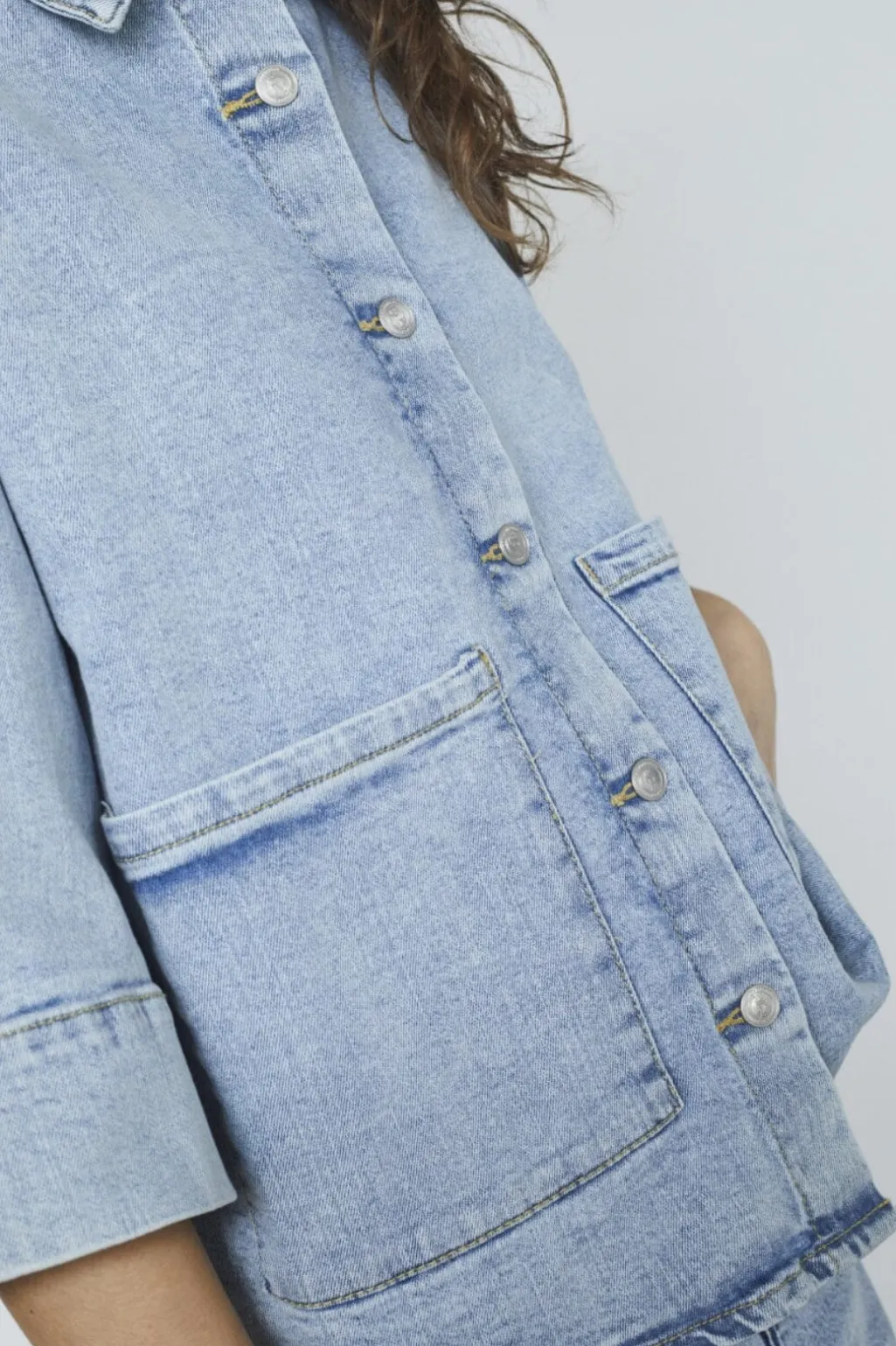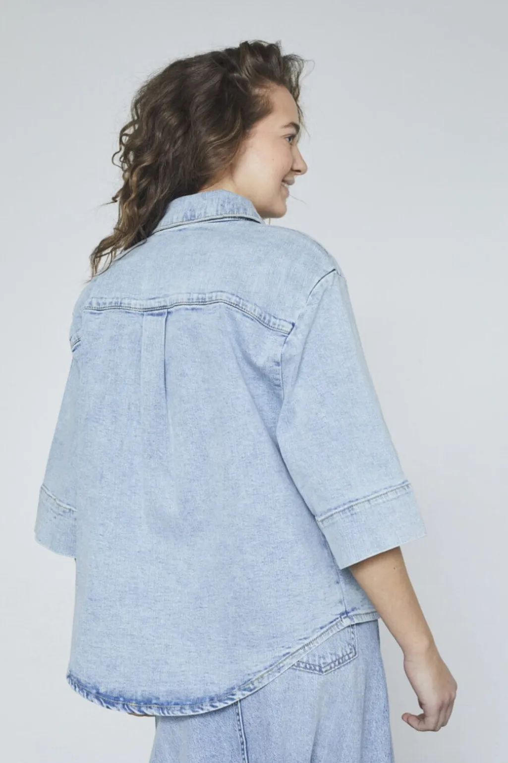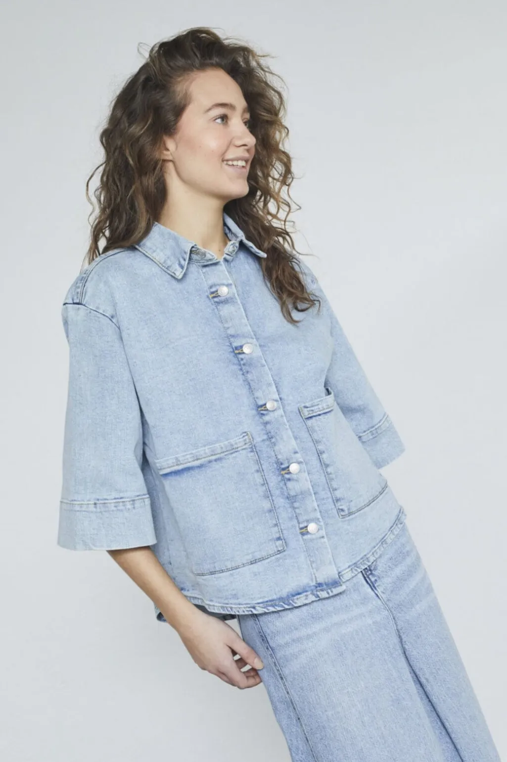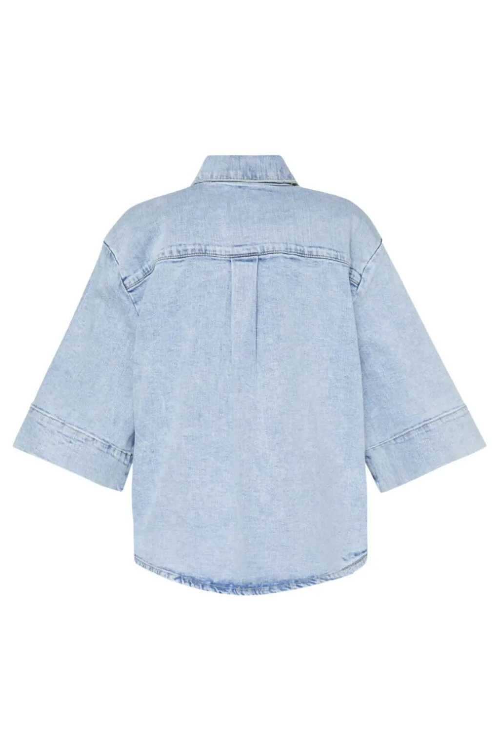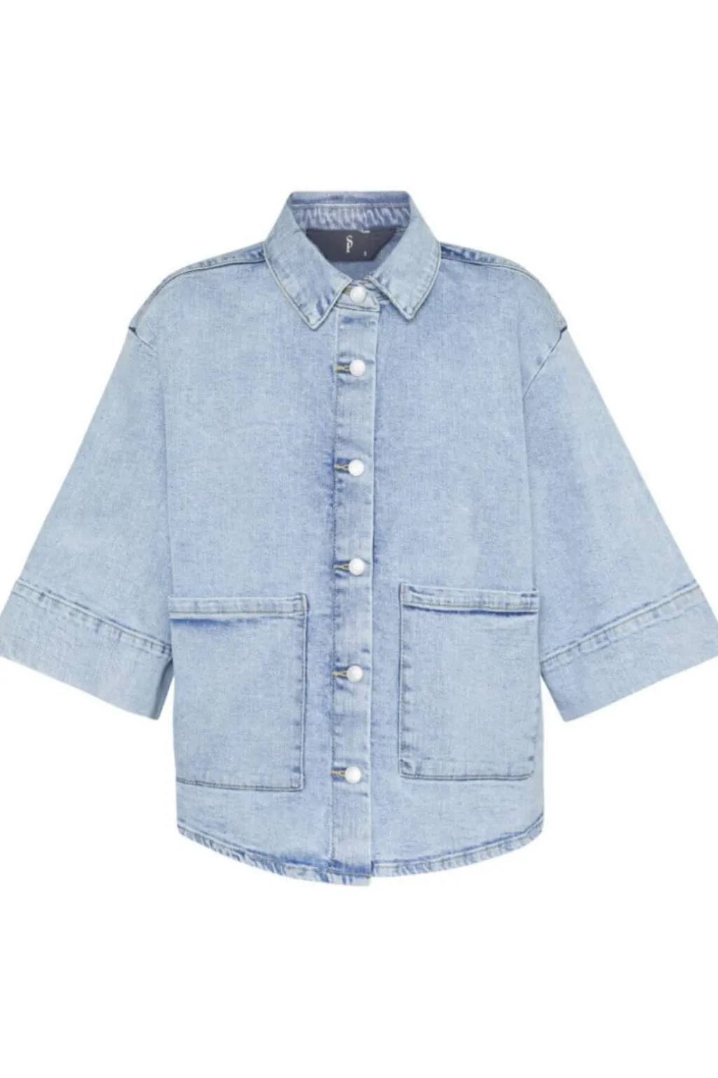 Denimskjorte fra Sisters Point i en lys blå vask. Skjorten har trekvartærmer og store knapper foran. To frontlommer og skjortekrave giver et casual udtryk.