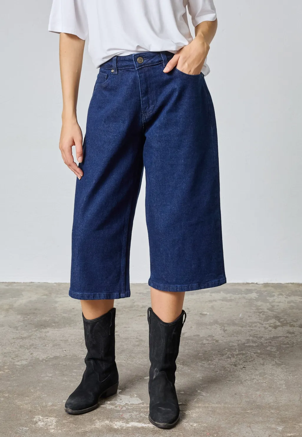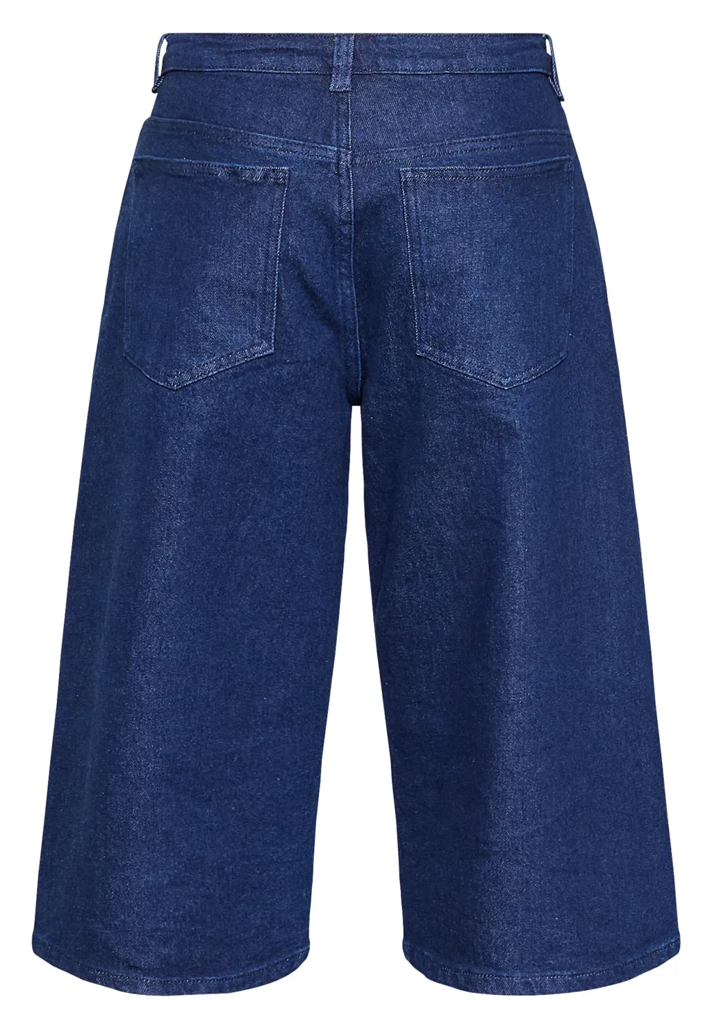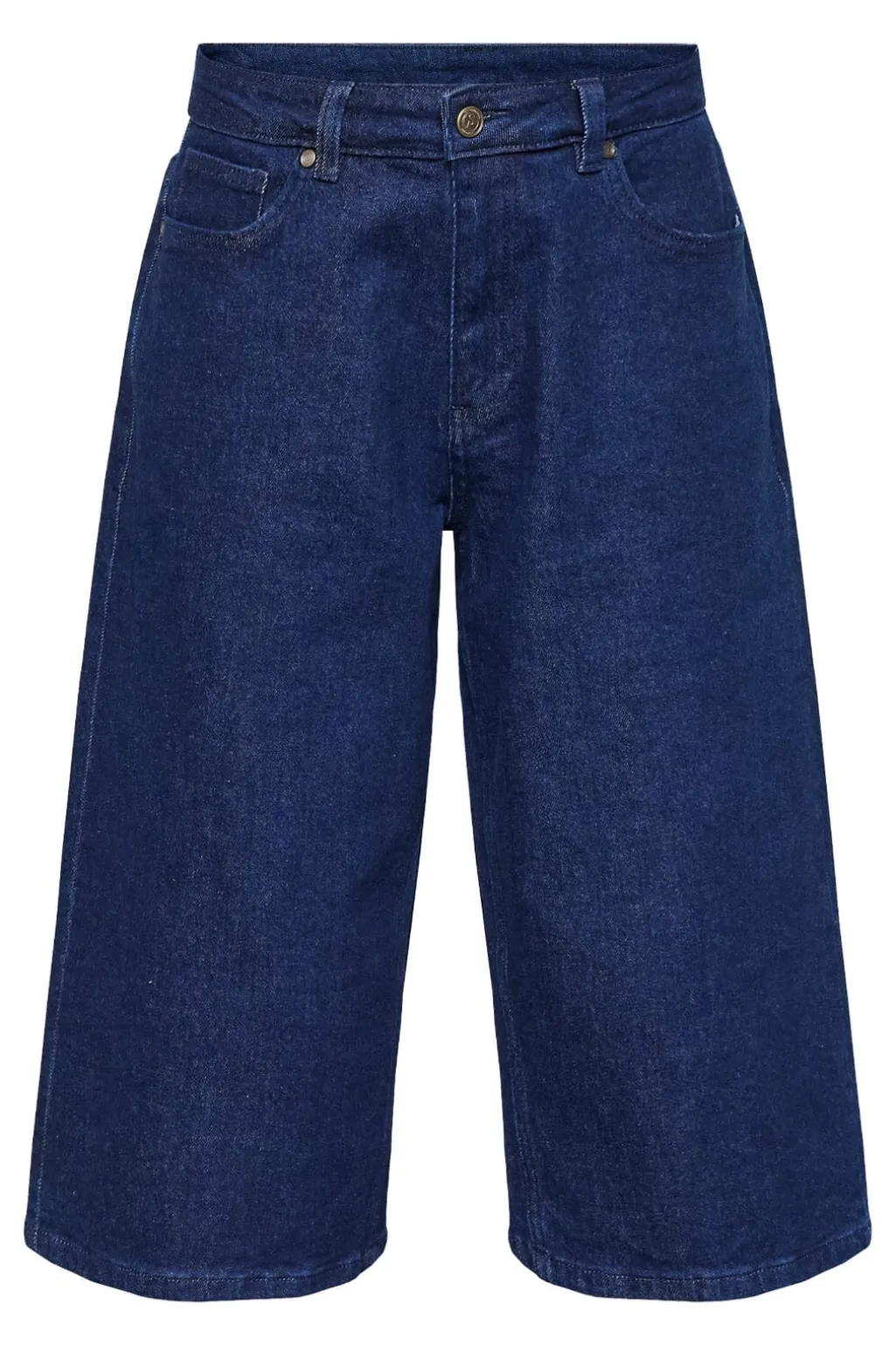 Denimshorts fra Sisters Point i mørkeblå denim. Shortsene har en løs pasform med lige ben og en længde til midt på læggen.