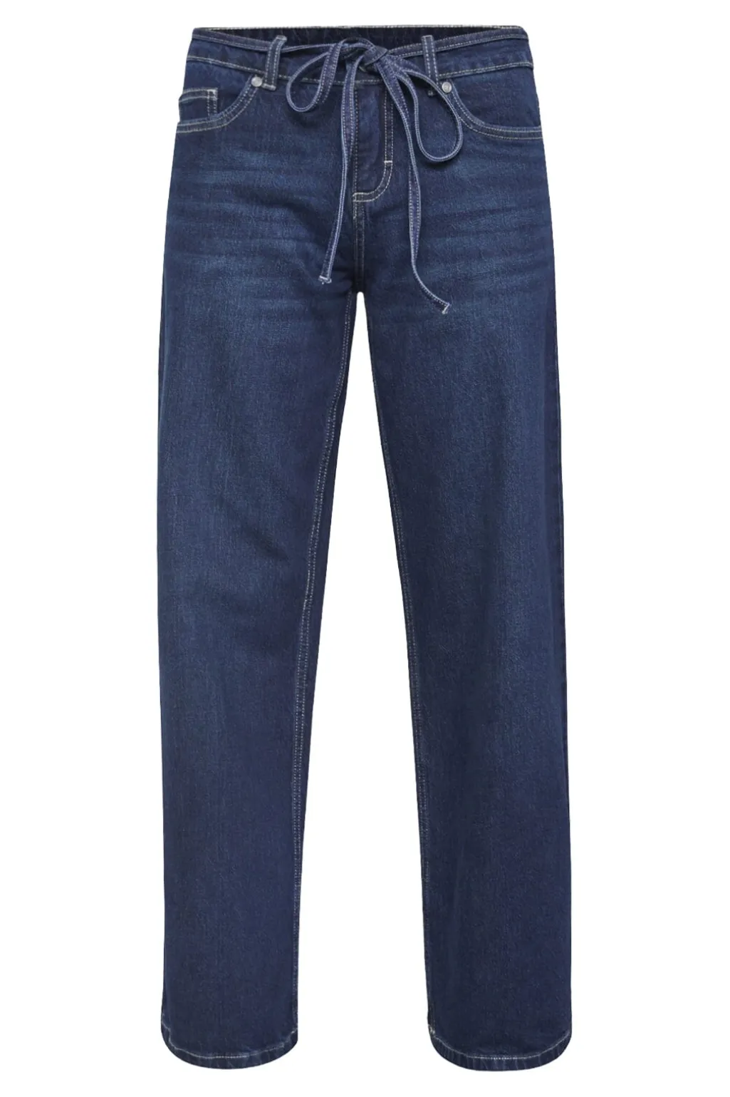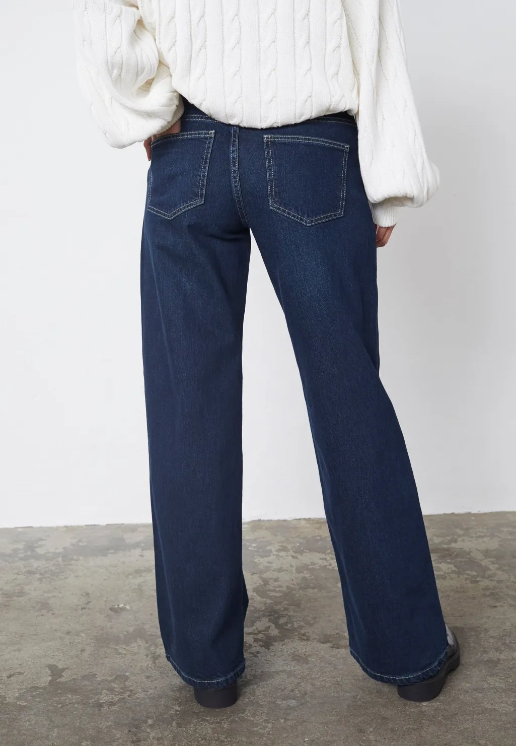 Mørkeblå jeans fra Sisters Point med en løs pasform. Jeansene har bindebånd i taljen og er lavet i en mørkeblå vask.
