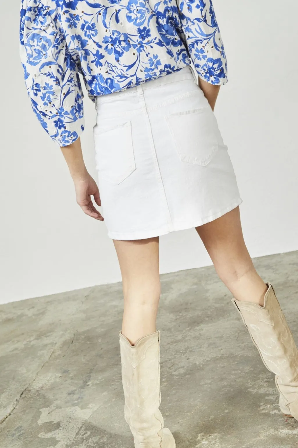 Hvid denimnederdel fra Sisters Point med kort længde. Den har en slim fit-pasform og en linning med knap- og lynlåslukning. Nederdelen er lavet i en blød bomuldsblanding.