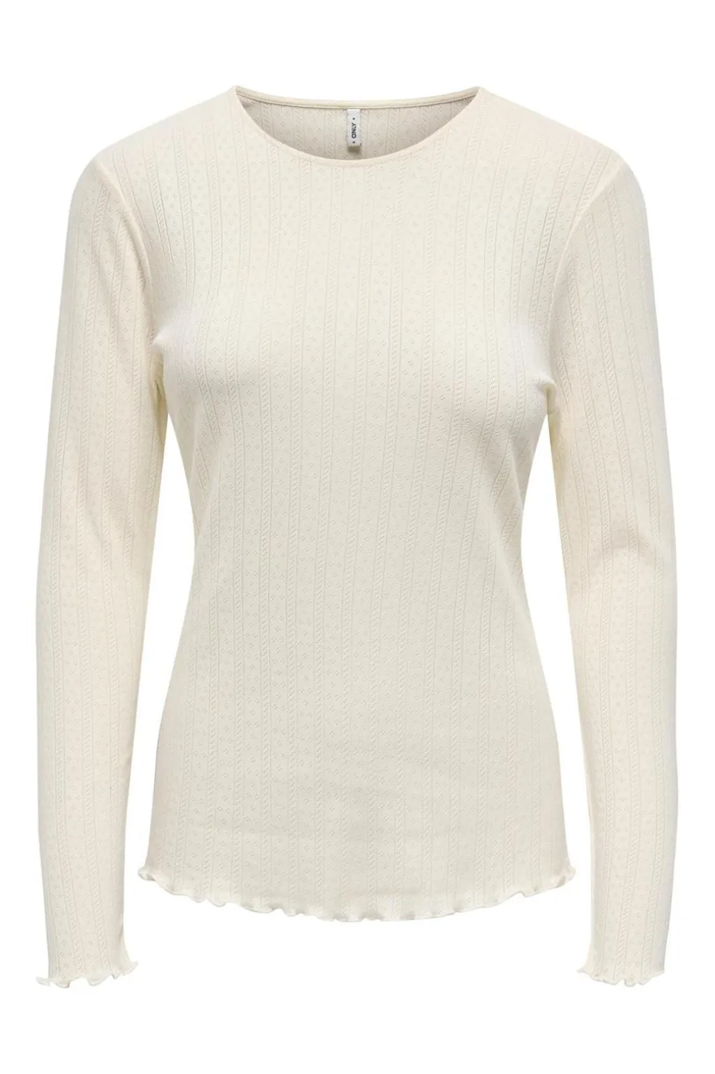 Langærmet top fra Only i cremehvid med ribbet struktur. Toppen har en rund halsudskæring og rynkede kanter ved ærmerne, hvilket giver et let udtryk.