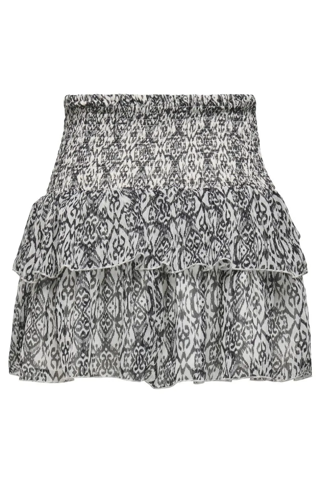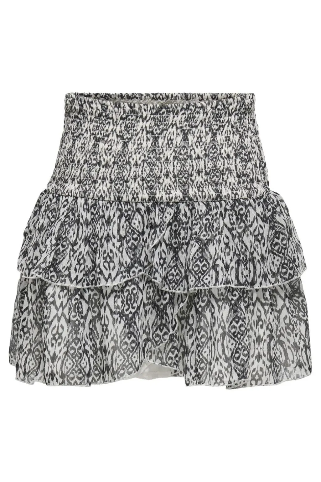 Kort nederdel fra Only med sort-hvidt ikatmønster. Nederdelen har et lagdelt design med flæser og smock-detaljer, der skaber bevægelse i stoffet.